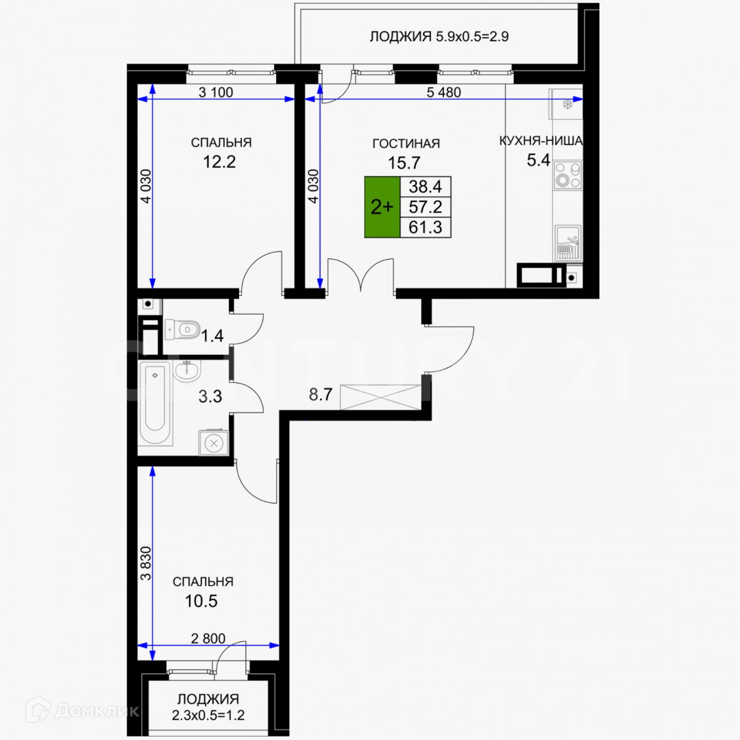Общая площадь 61.3 м2