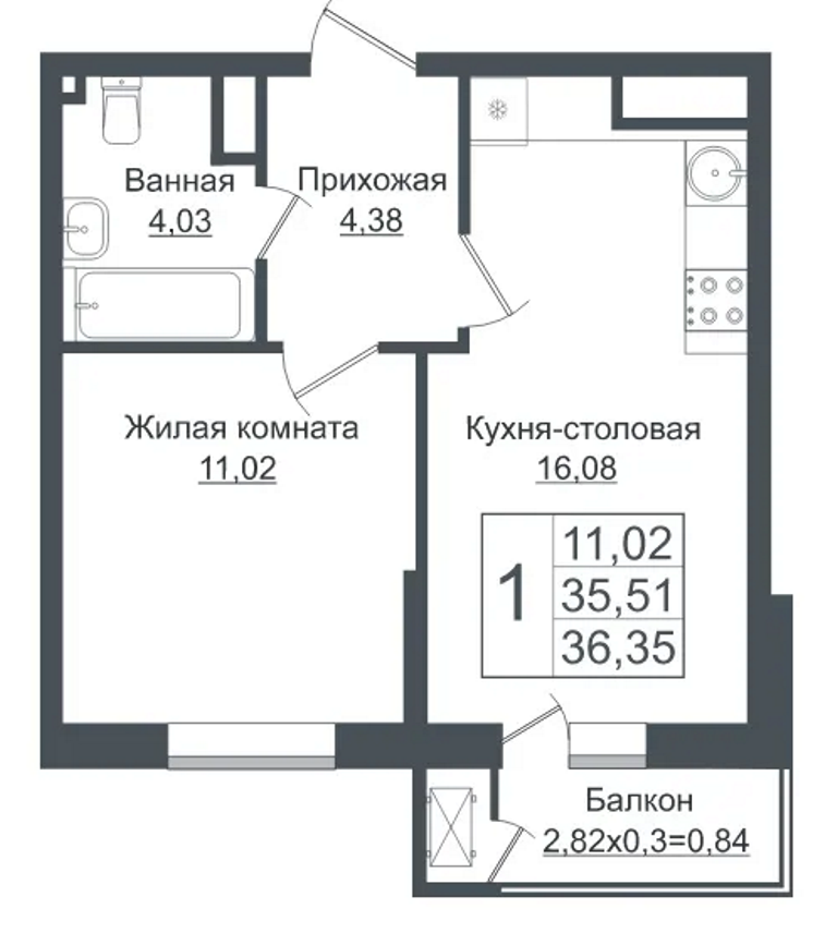Общая площадь 36.4 м2