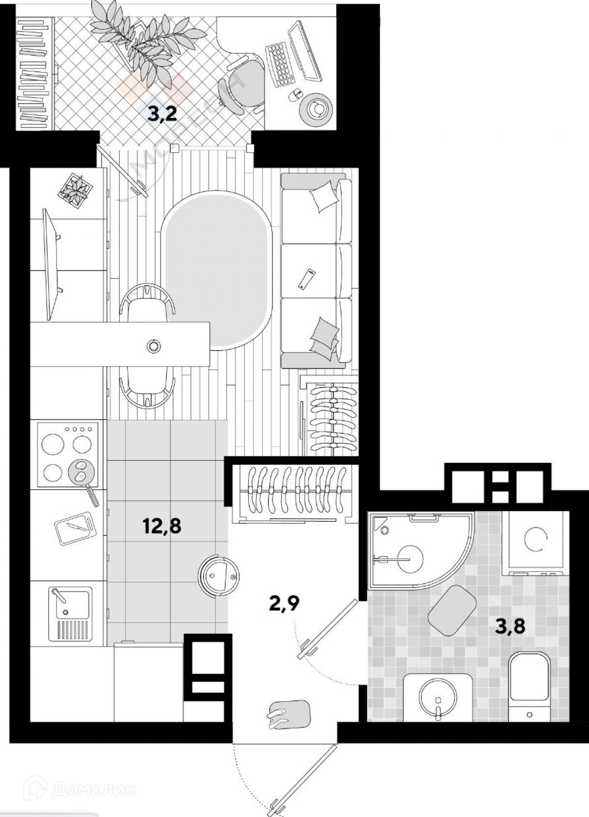 Общая площадь 19.5 м2