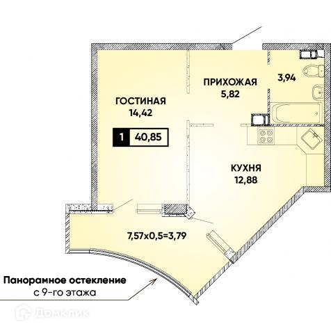 1-комнатная квартира, 40.58 м2, этаж 12 / 22, на продажу в Краснодаре, улица Григория Булгакова, 10