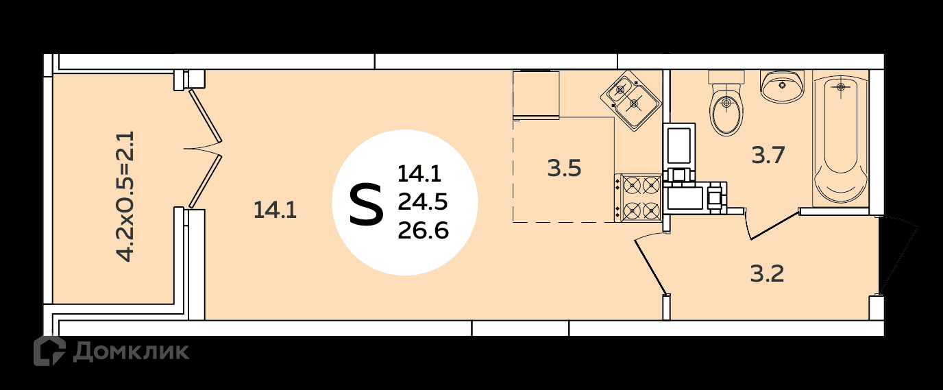 Общая площадь 26.6 м2