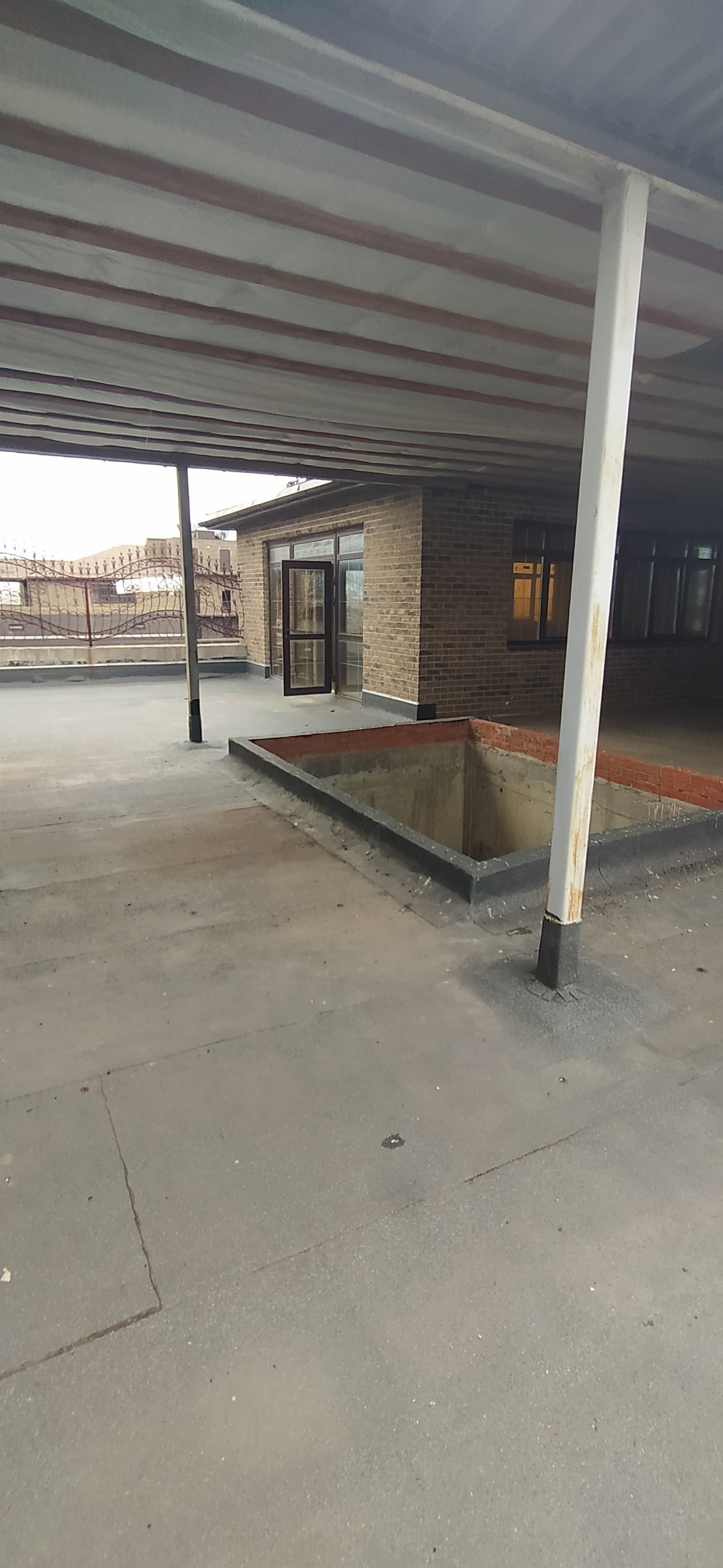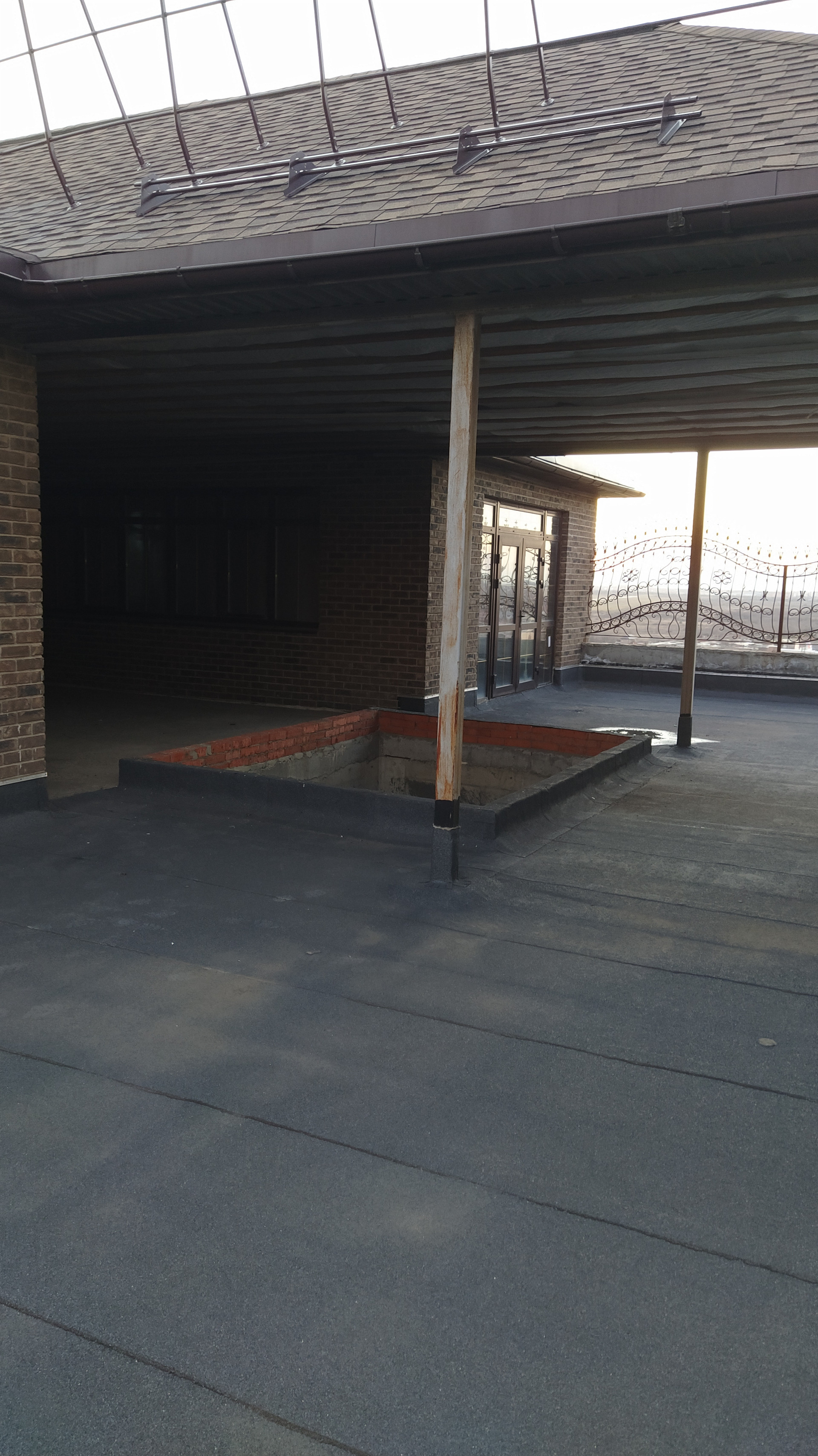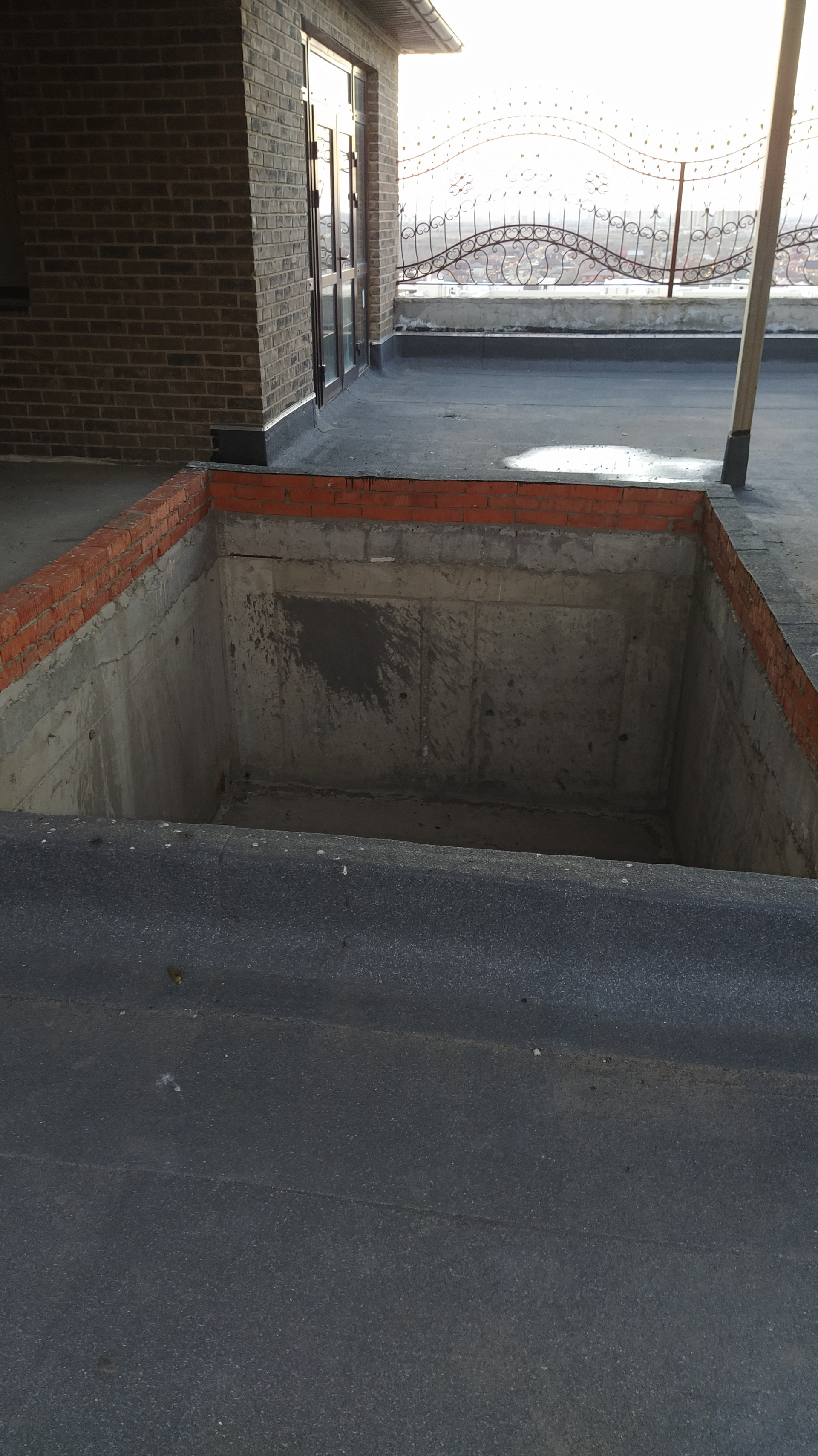 Терраса также прямоугольной формы с объемным квадратным углублением (25м) посредине, напротив бассейна - куда не достают ветер, дождь, снег.