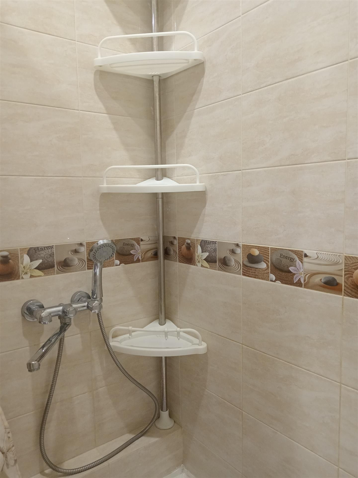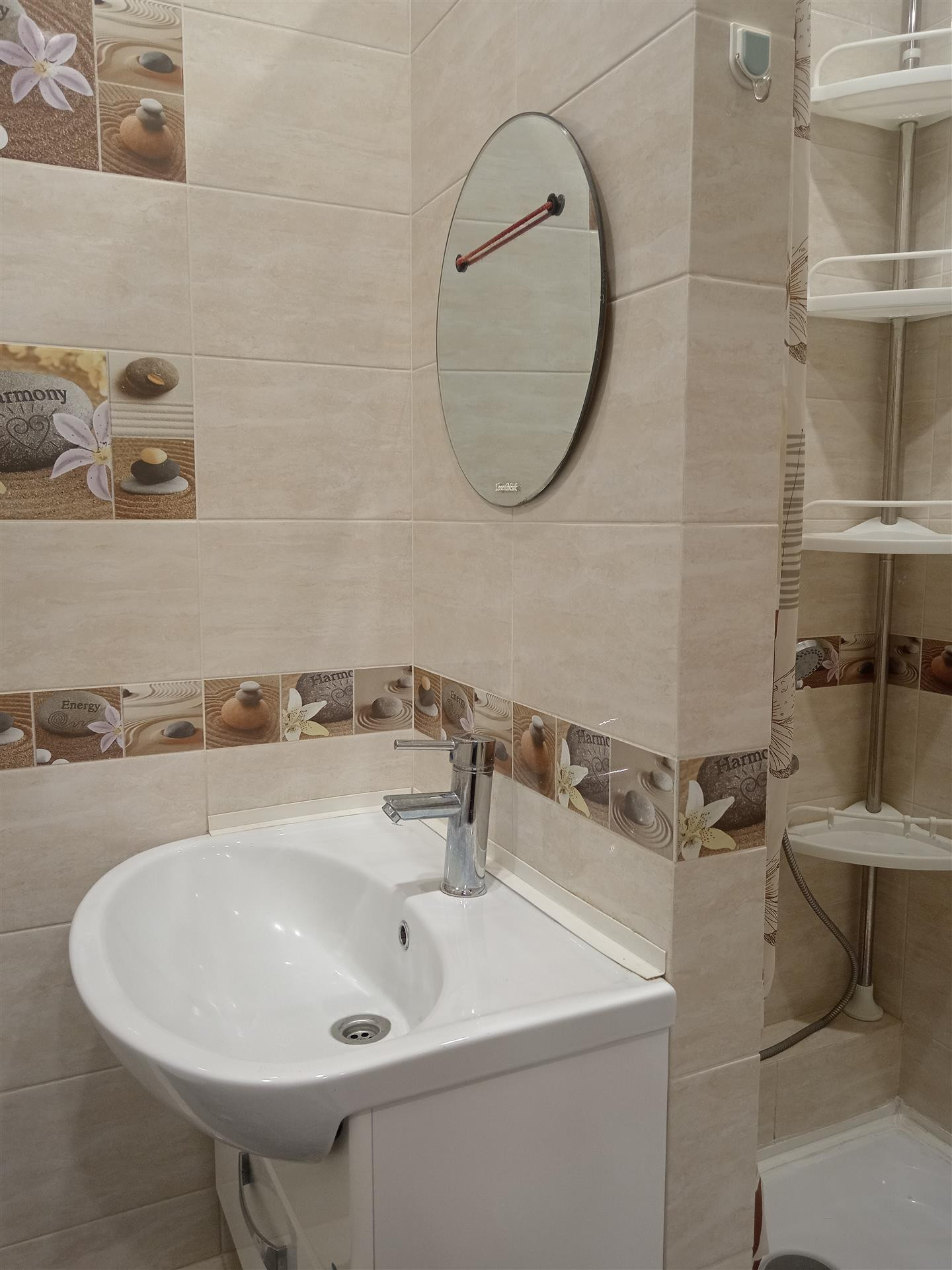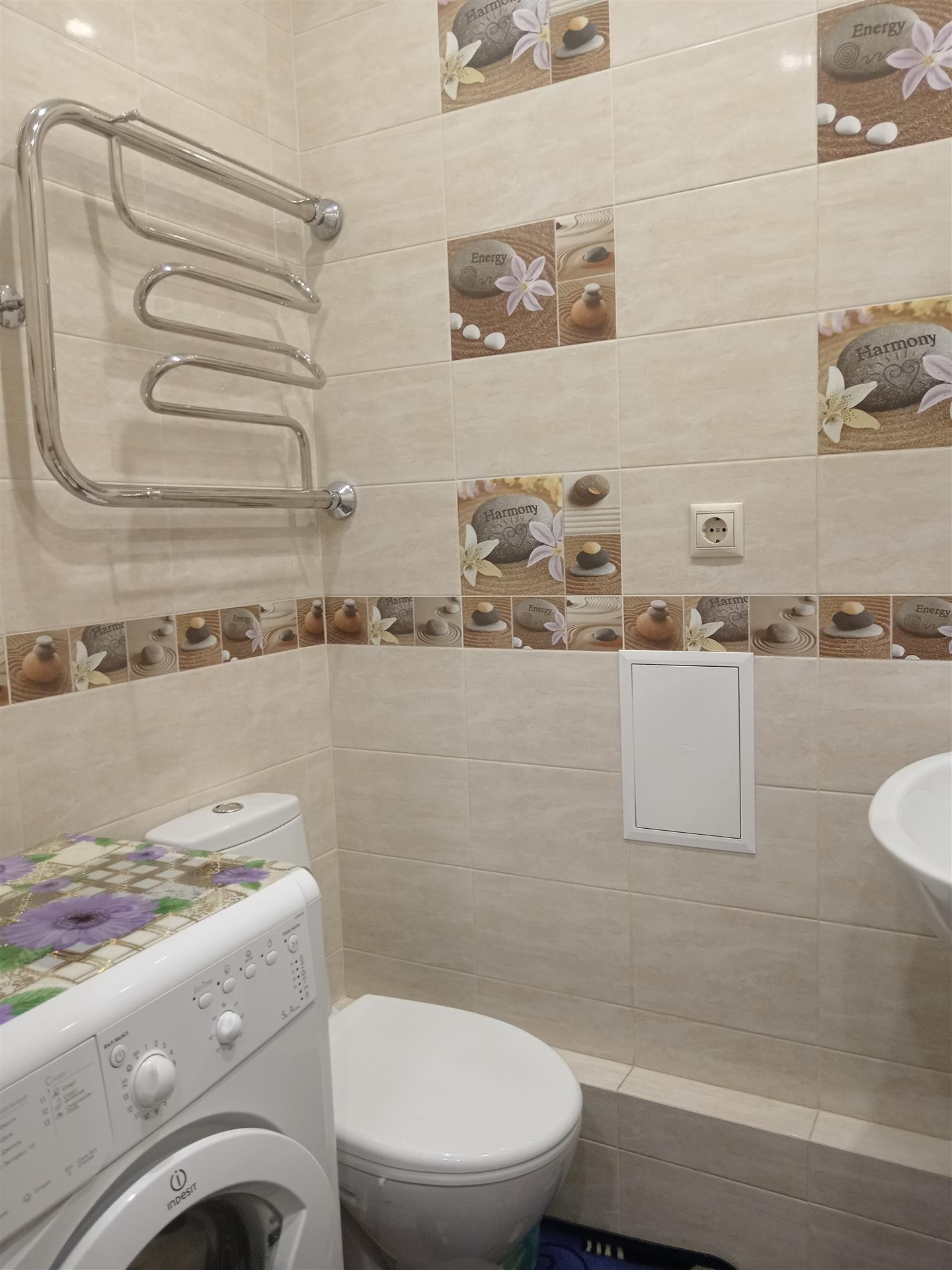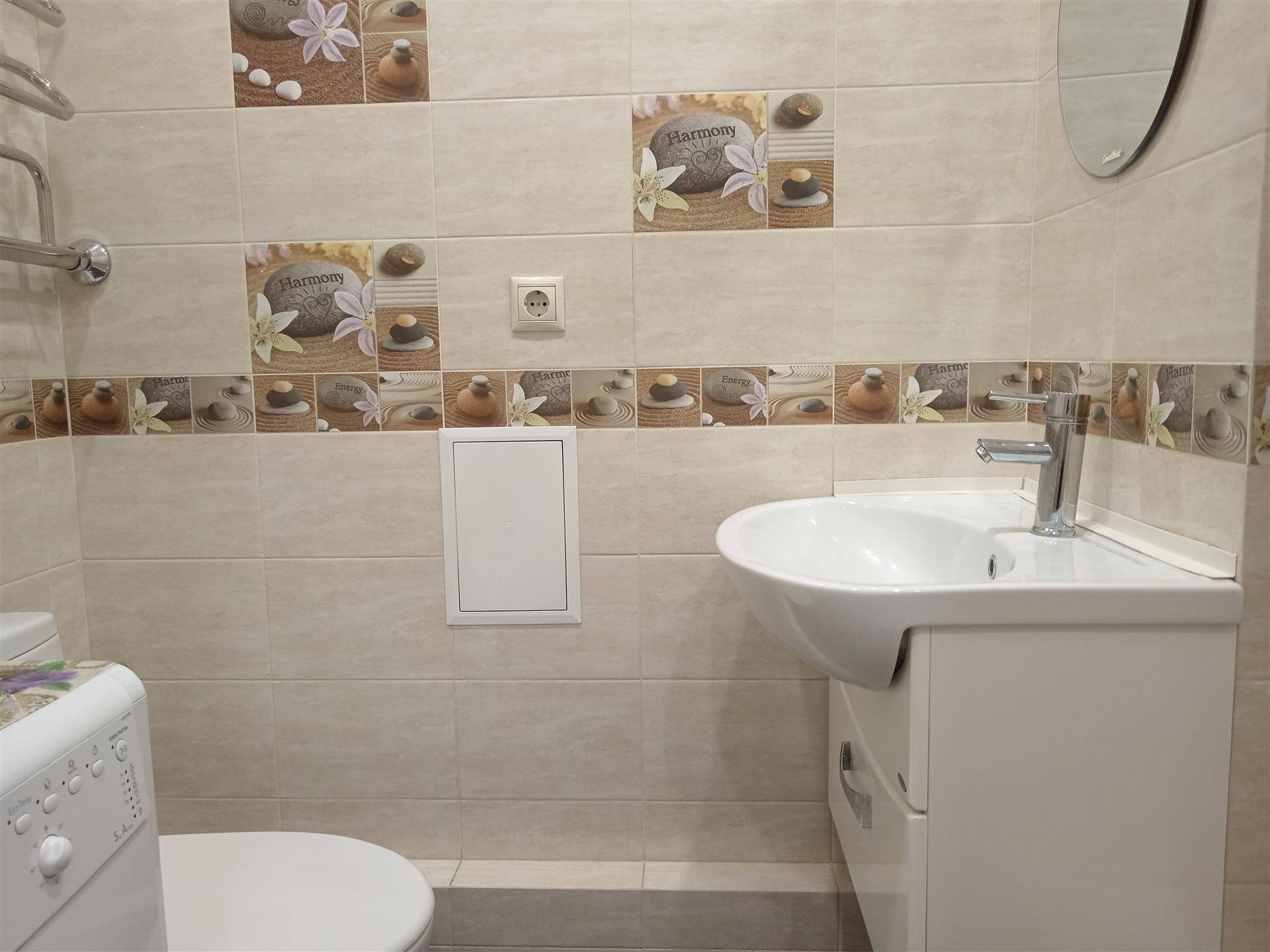 Санузел в плитке пастельных тонов,удобно расположены душевая,унитаз и стиральная машина.По всей квартире сделаны теплые полы,зимой в ней очень тепло и комфортно.