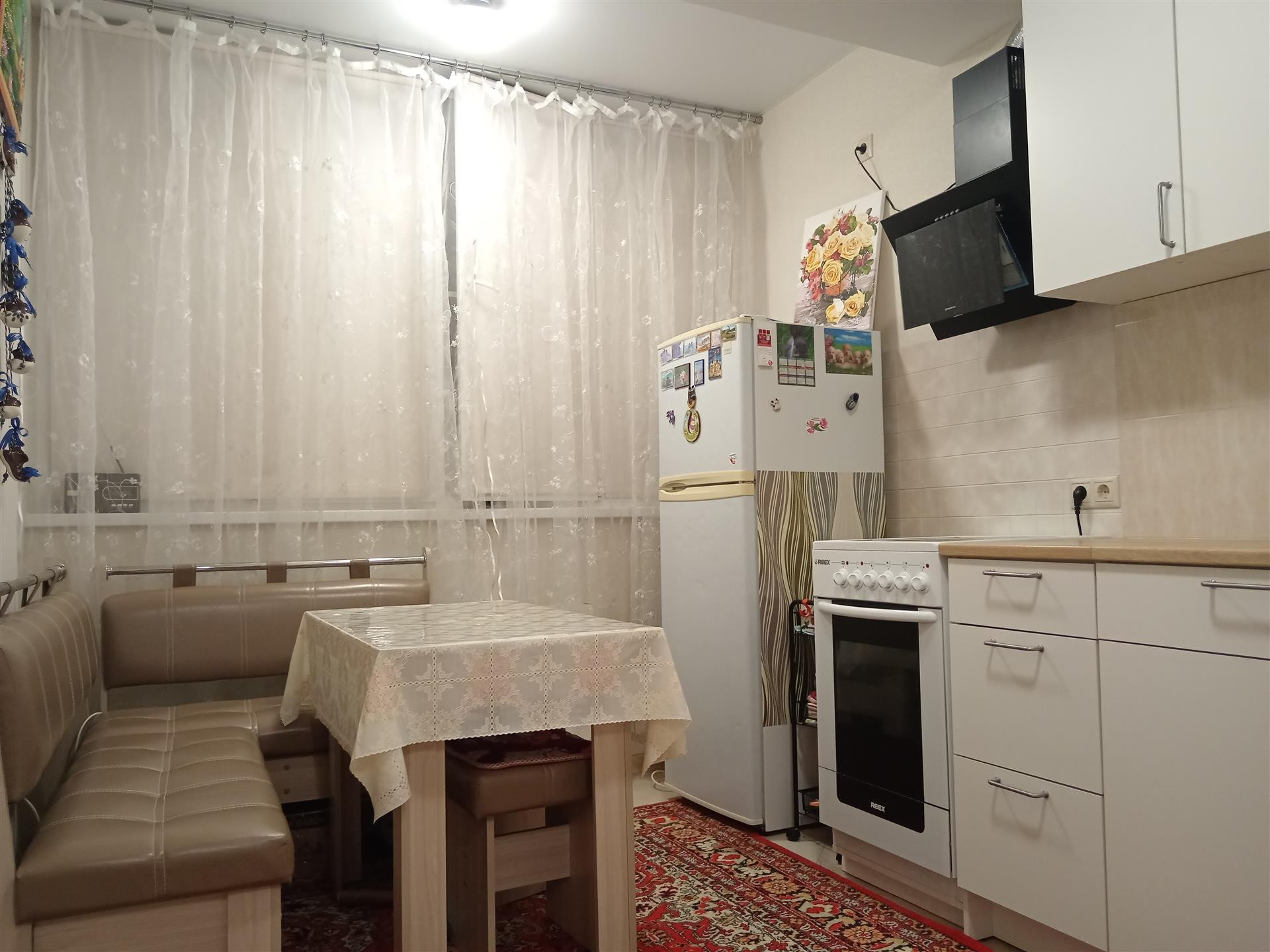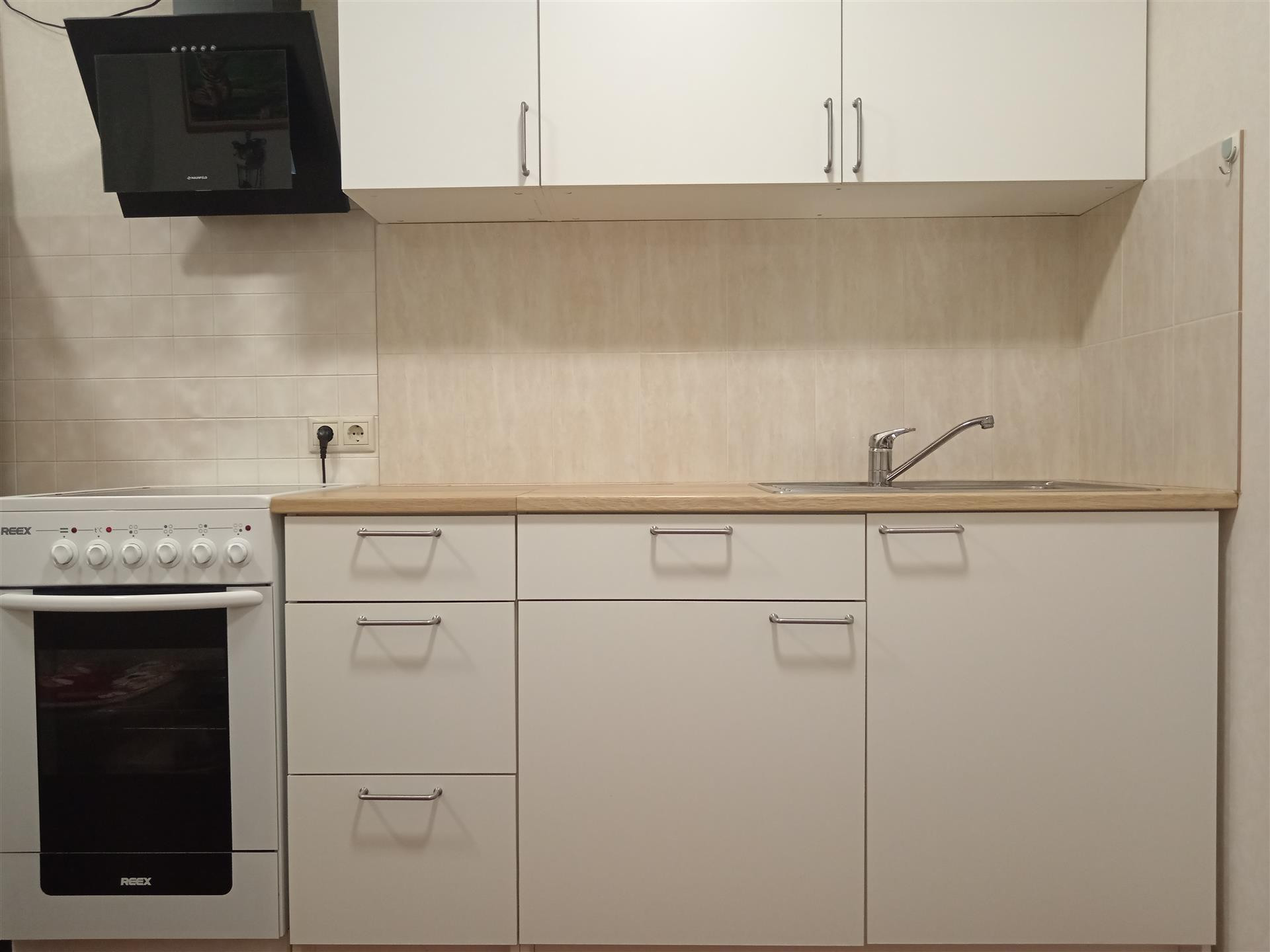 В кухне установлена польская мебель, стеклокерамическая соло плита и мощная вытяжка ,удобный уголок со стульями.