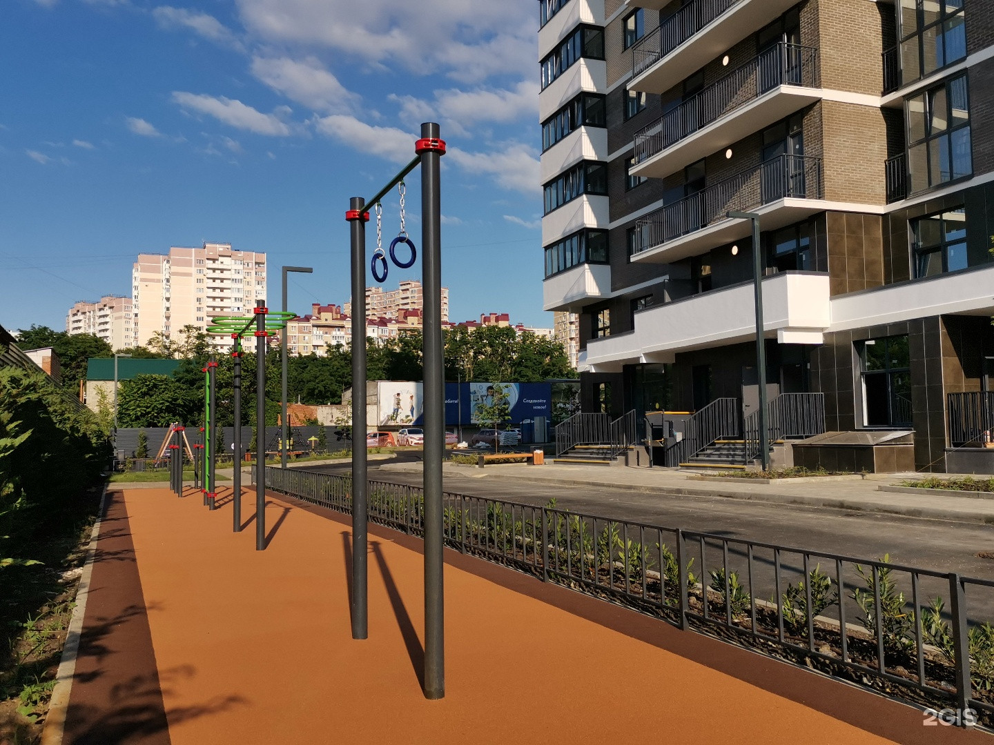 Ландшафтное озеленение. Идеальный mix деревьев и кустарников из лучших питомников Юга России. Парковочные места с навесами на территории комплекса и по периметру ЖК. Детские площадки и универсальный спортивный комплекс во дворе. Обустроенные колясочные.