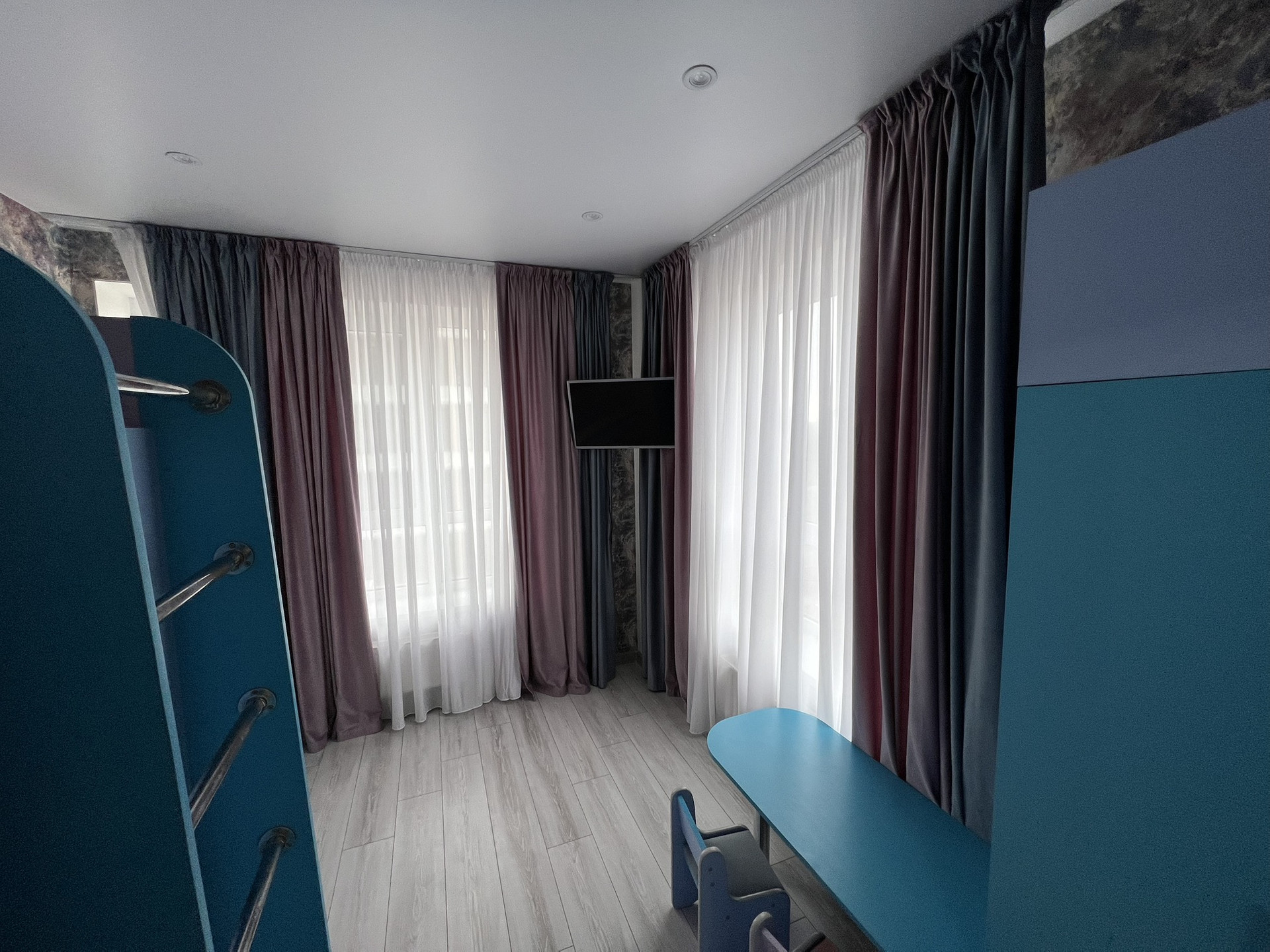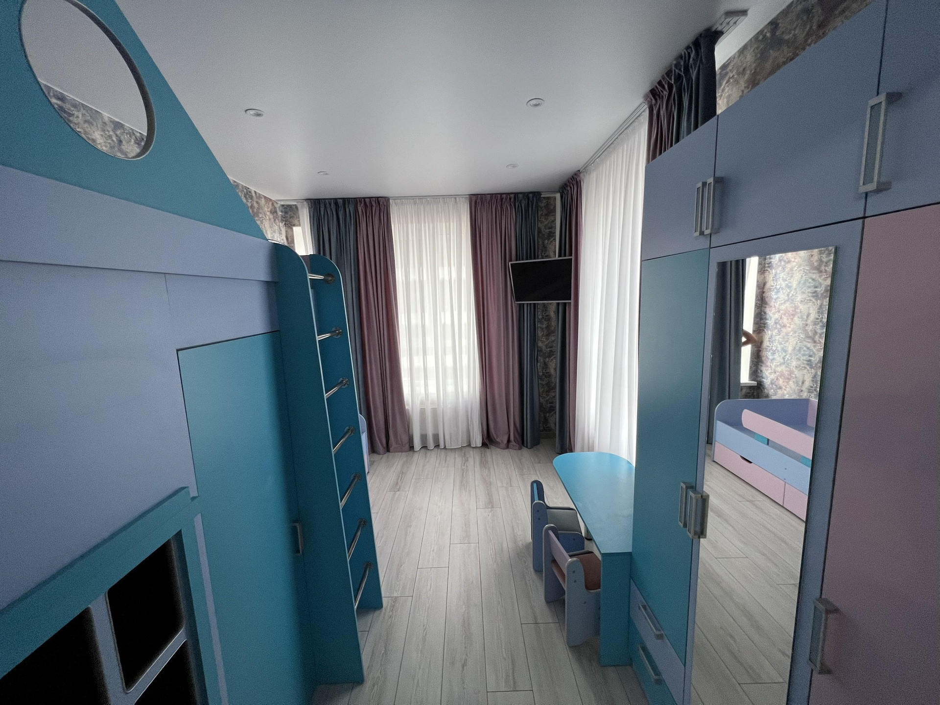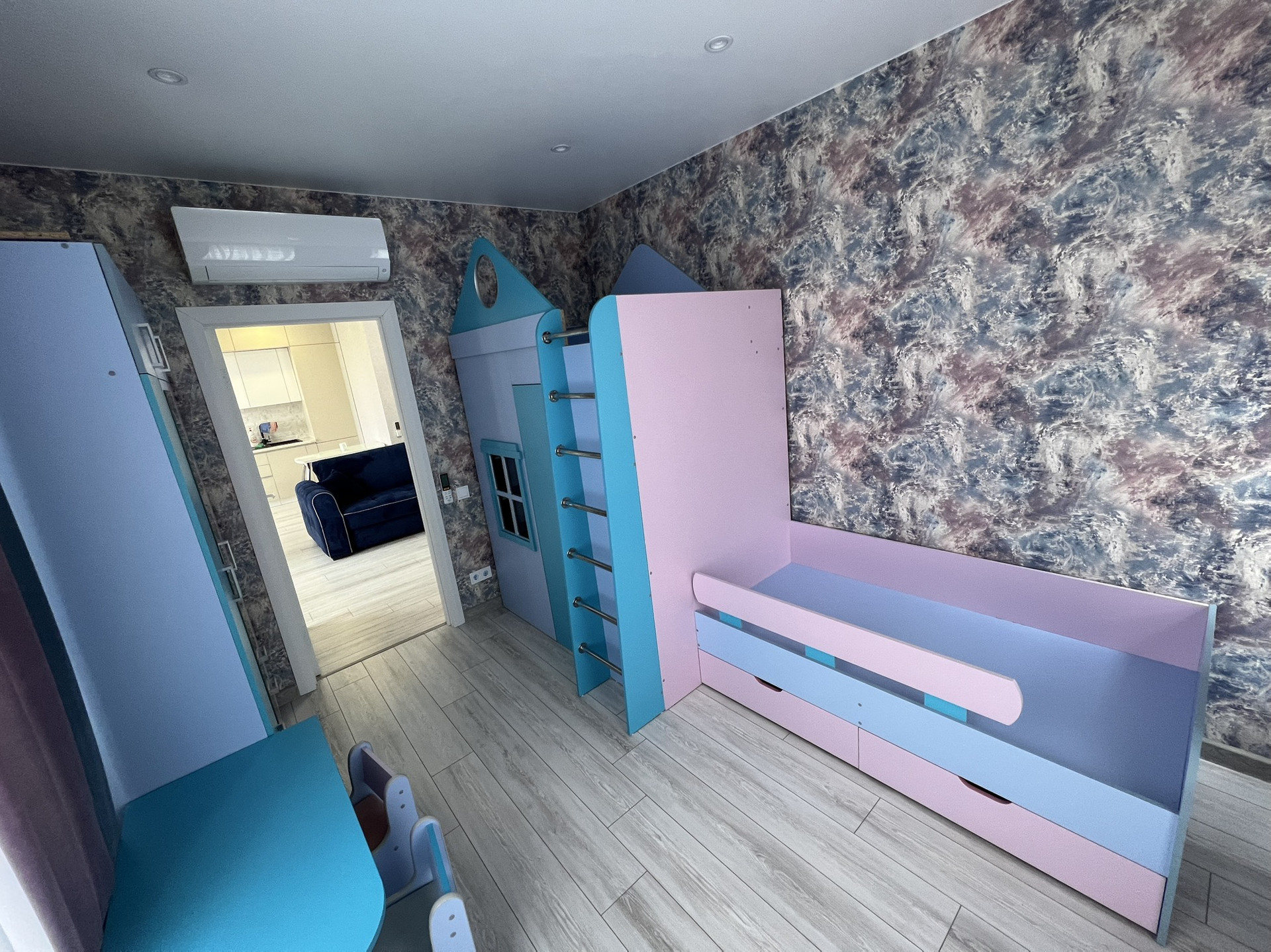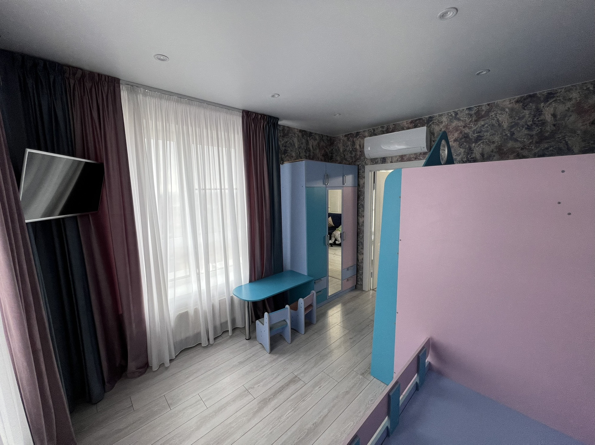 Из мебели остается все (синий диван, кухня со встроенной техникой, холодильник, кухонный стол, стиральная машина, встроенный шкаф в гостиной, кровать с матрасом в спальне, детский уголок со шкафом в детской, шторы, сплиты)
