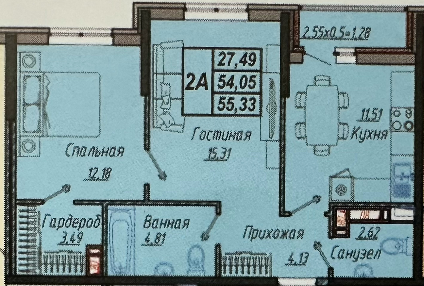 Общая площадь 55.33 м2