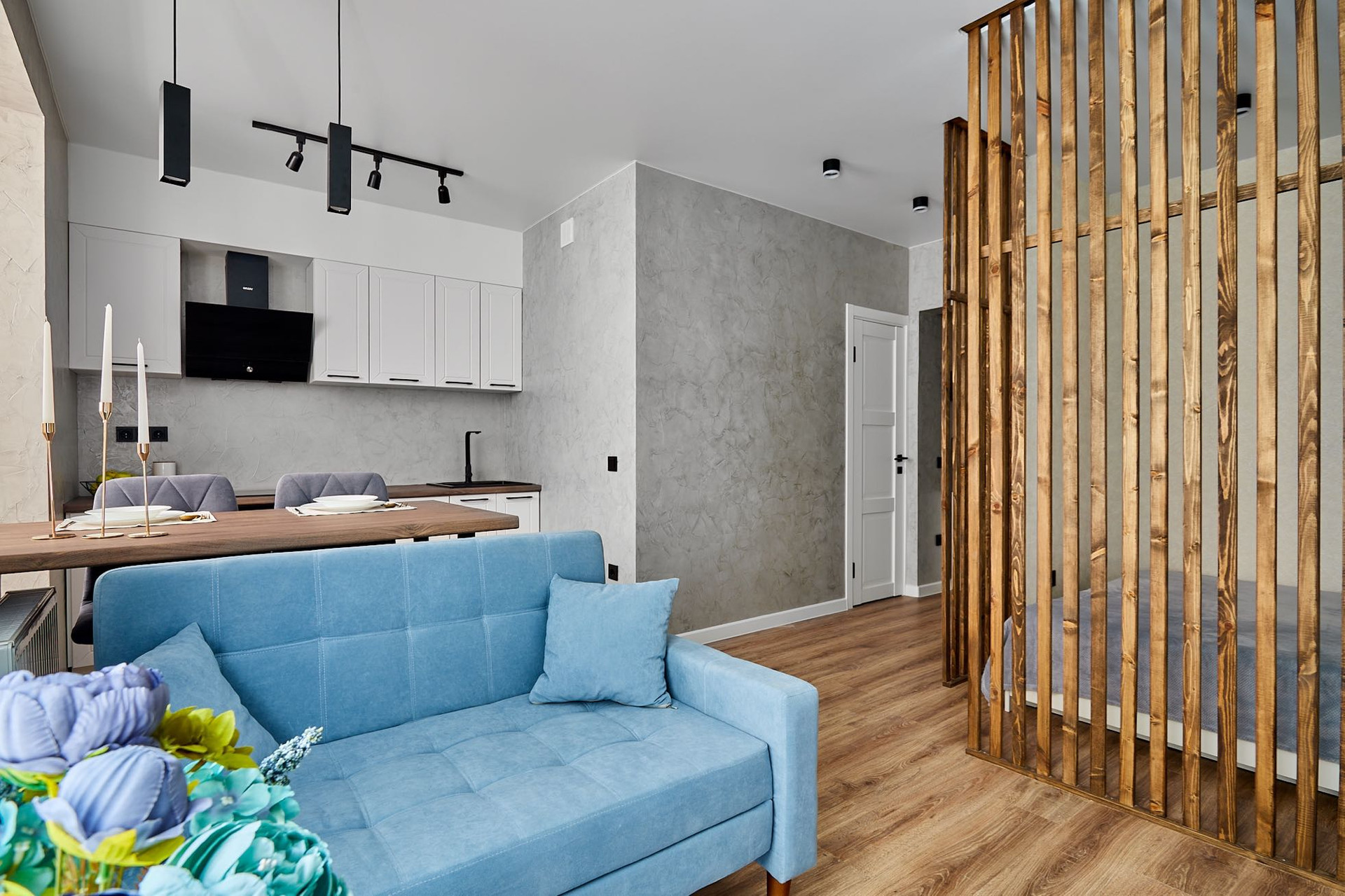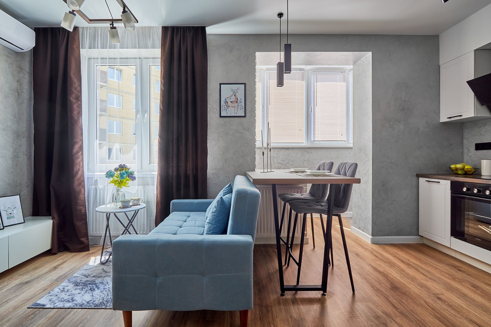 2. Гостиная с раскладным диваном, журнальным столиком и тумбой под тв (в стене есть все необходимые выводы)