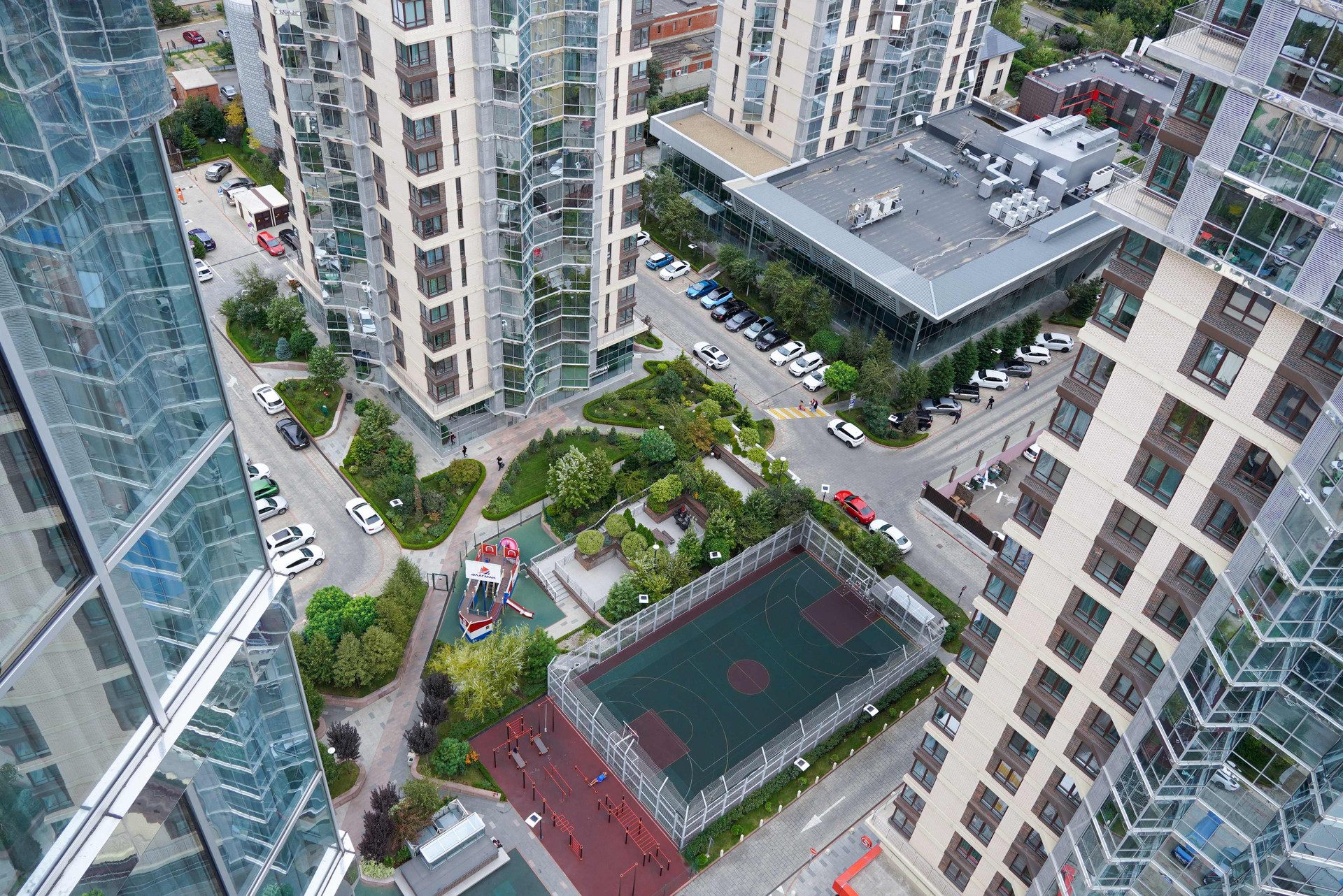 Охраняемая территория с видеонаблюдением. Для жильцов комплекса предусмотрены детские площадки, собственный фонтан, зоны барбекю, собственное спортивное поле, спортивная площадка, зона для воркаута, для детей создана водная зона. Во дворе много зелени. Ландшафтный дизайн подчеркивает уникальность комплекса. Благодаря большому расстоянию между домами, солнце будет в каждой квартире.