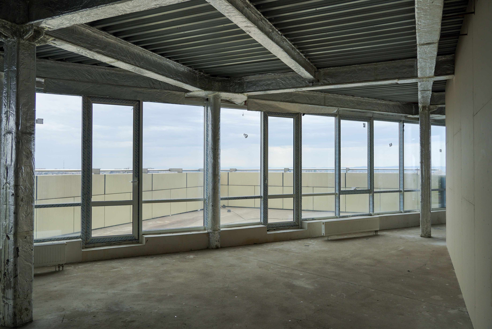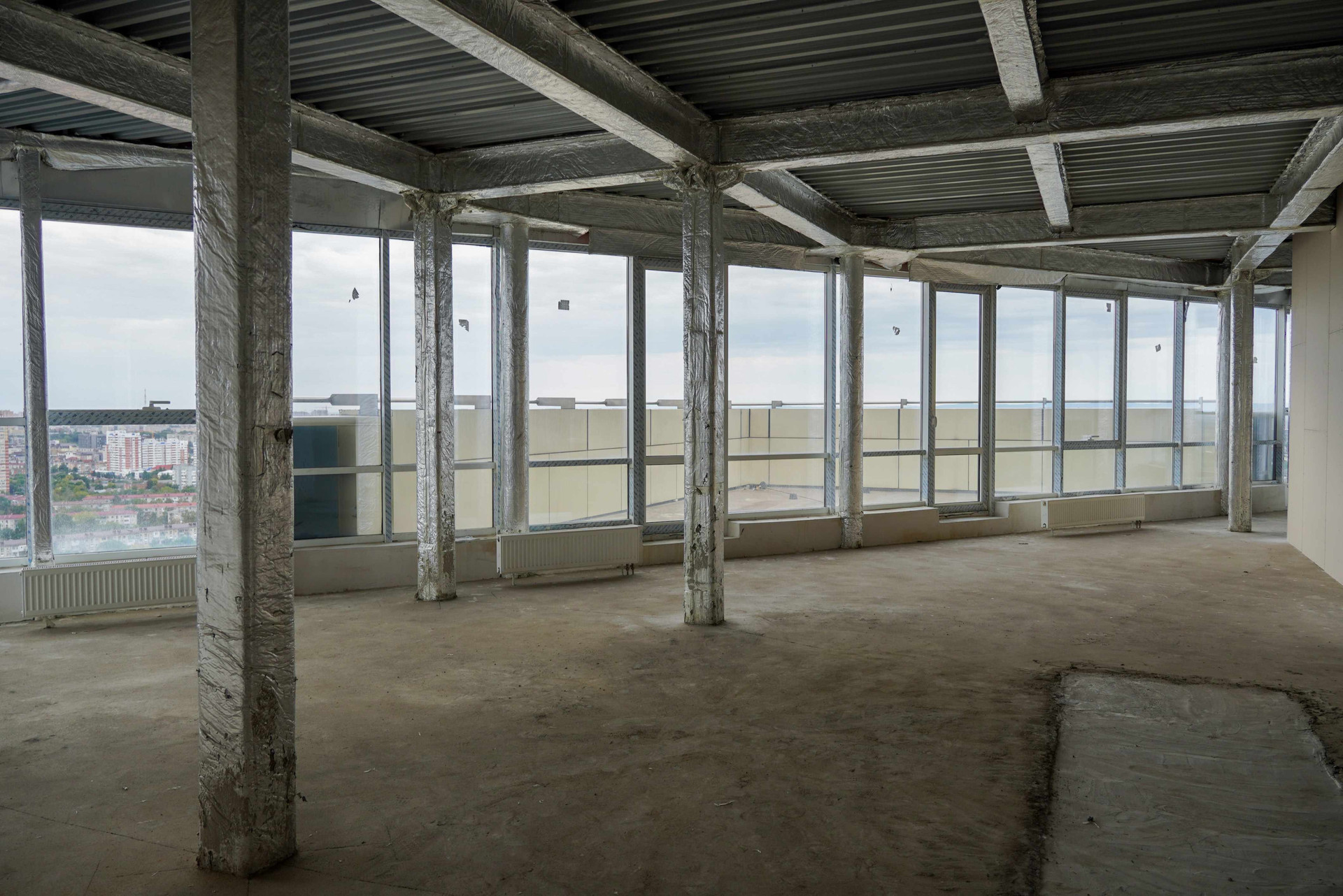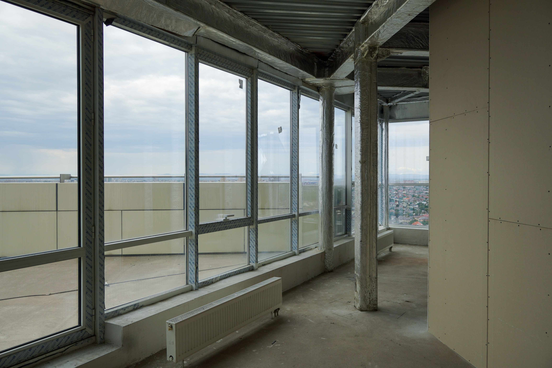 Прекрасная квартира с панорамным остеклением. Из каждого окна открывается превосходный вид на город. Вдалеке видны горы. Открытая терраса 32,1 м² позволит создать превосходную зону отдыха. Кухня-гостиная 44,8 м² станет местом для встреч с друзьями и родственниками. Можно каждый день собираться семьей за завтраками, обедами или ужинами. Спальная комната 73,8 м² за счет высоких потолков 2,85 кажется еще просторнее и светлее. В прихожей есть место для шкафа. Санузел совмещён: 11,7 м².