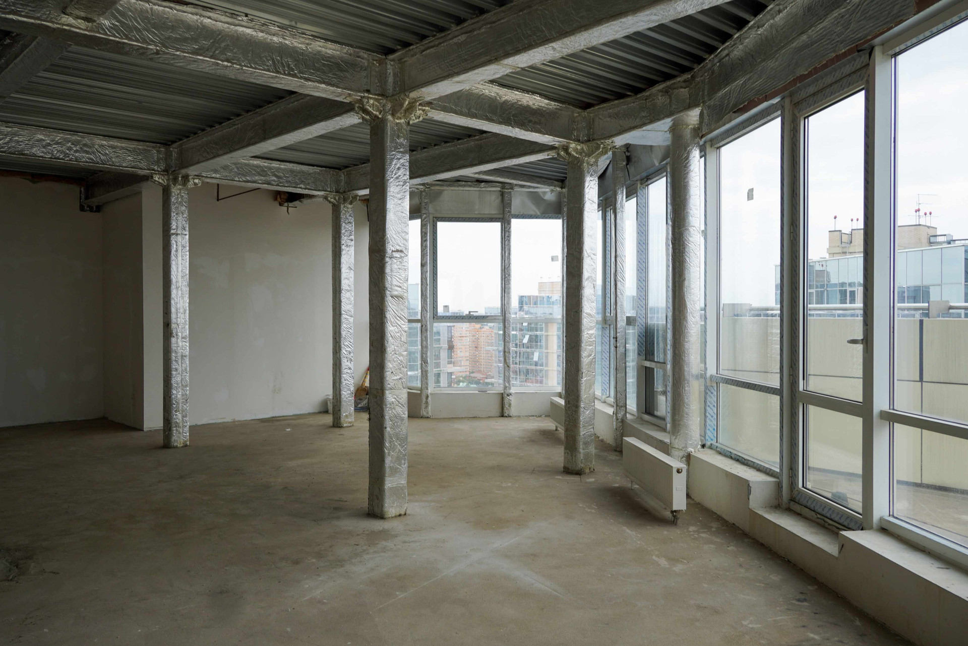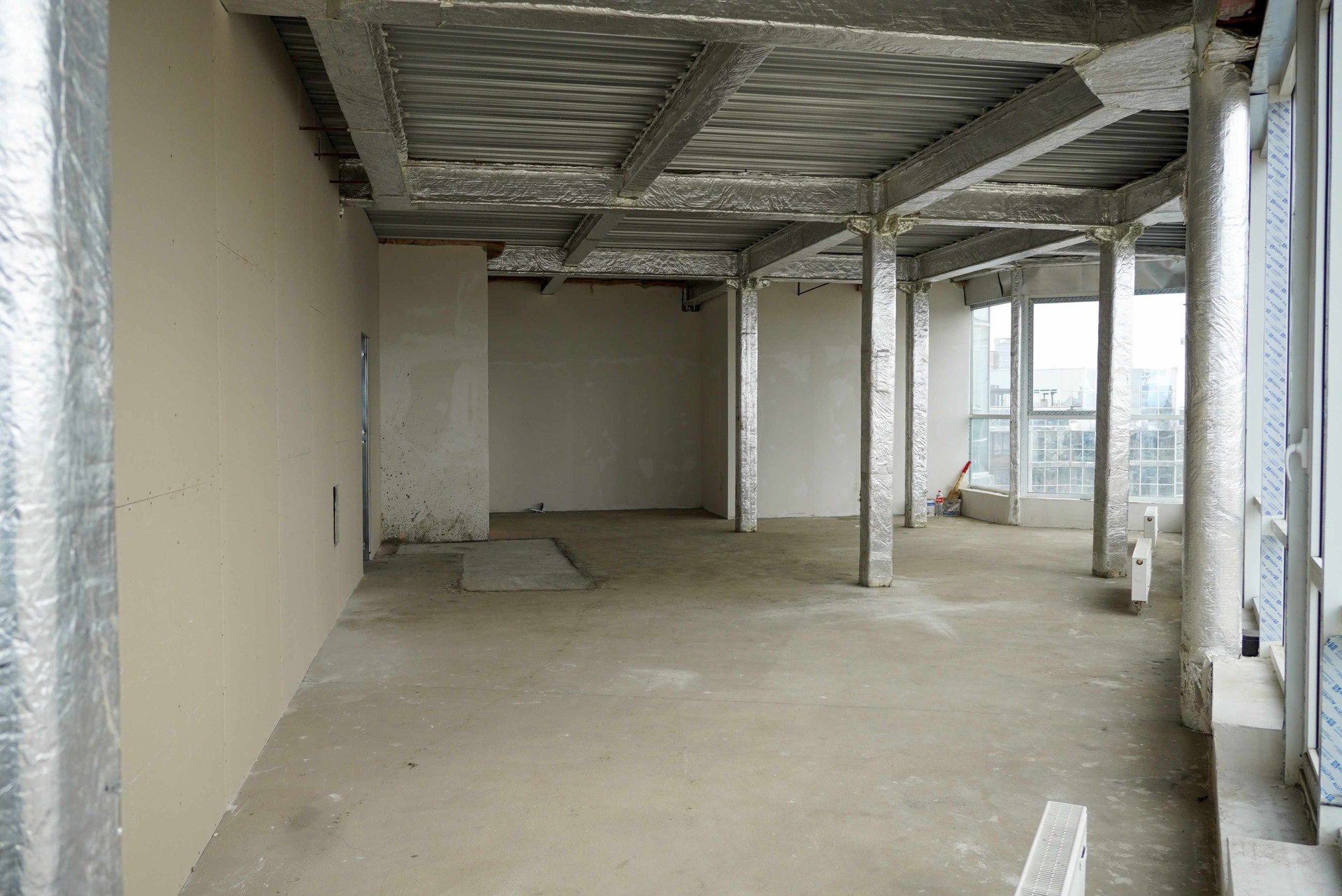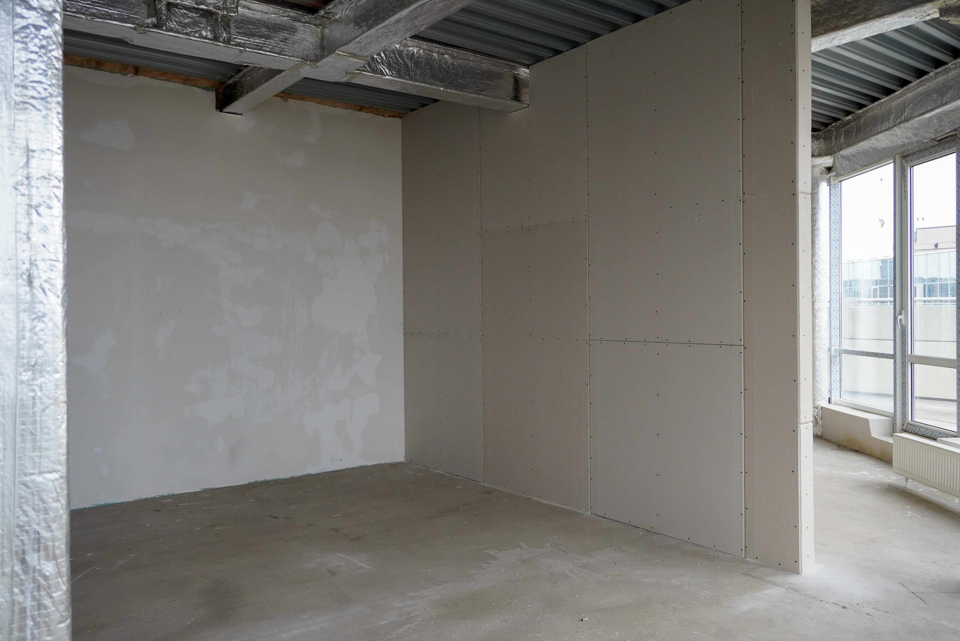 Предчистовая отделка: стены оштукатурены, стяжка, установлены счетчики (вода, электричество, тепло) и радиаторы отопления.