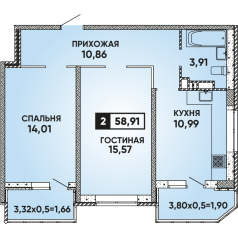 Общая площадь 58.91 м2