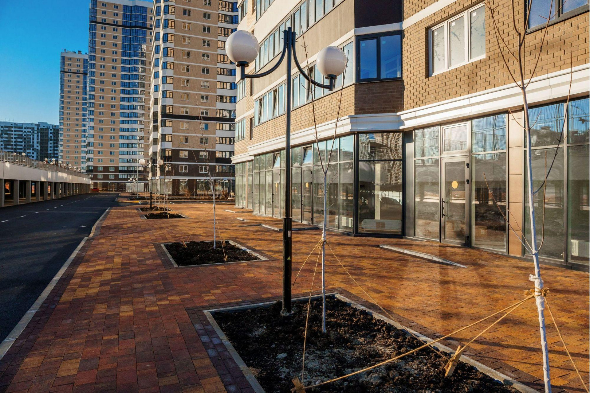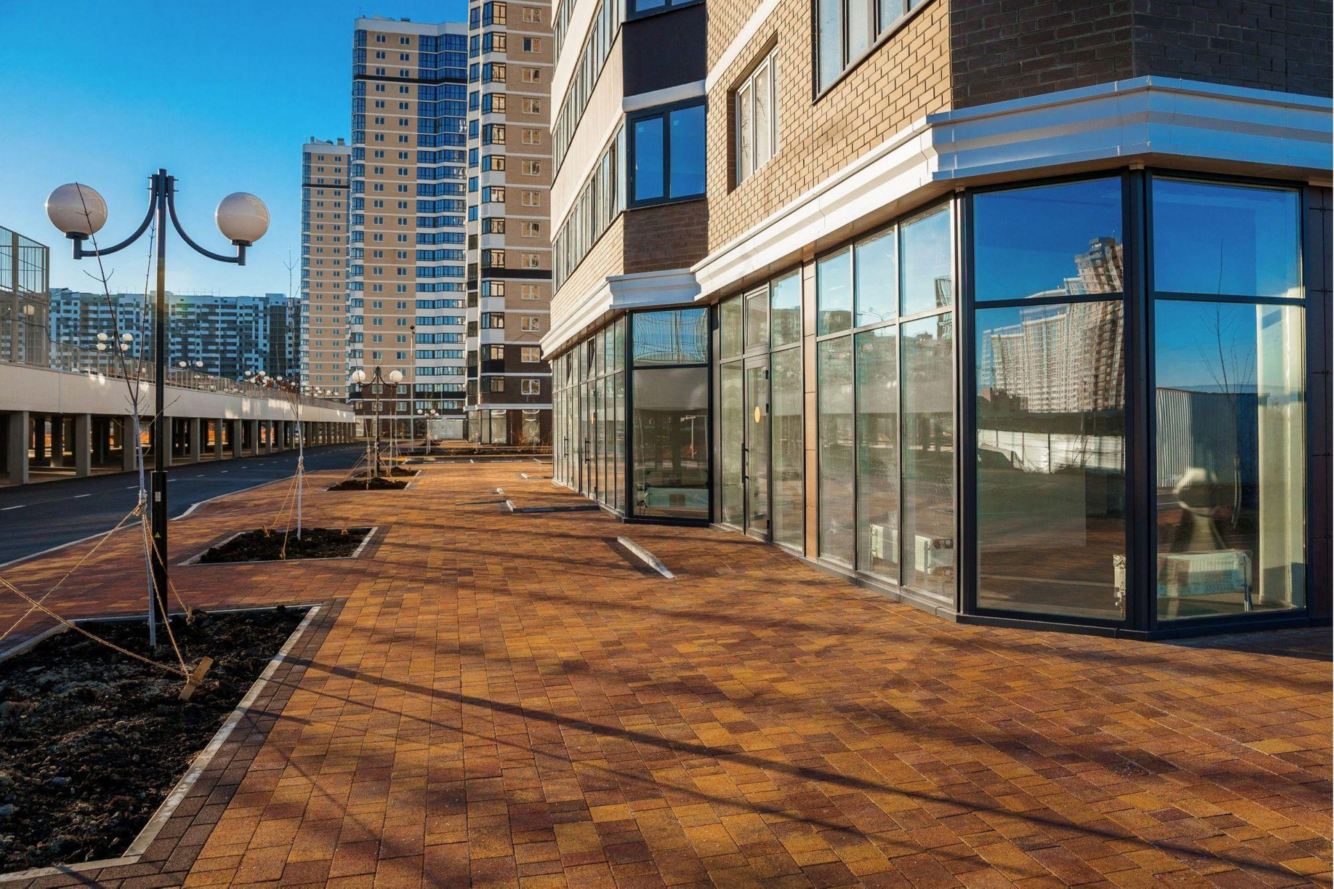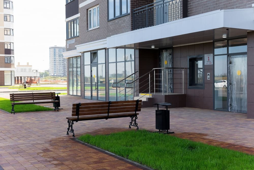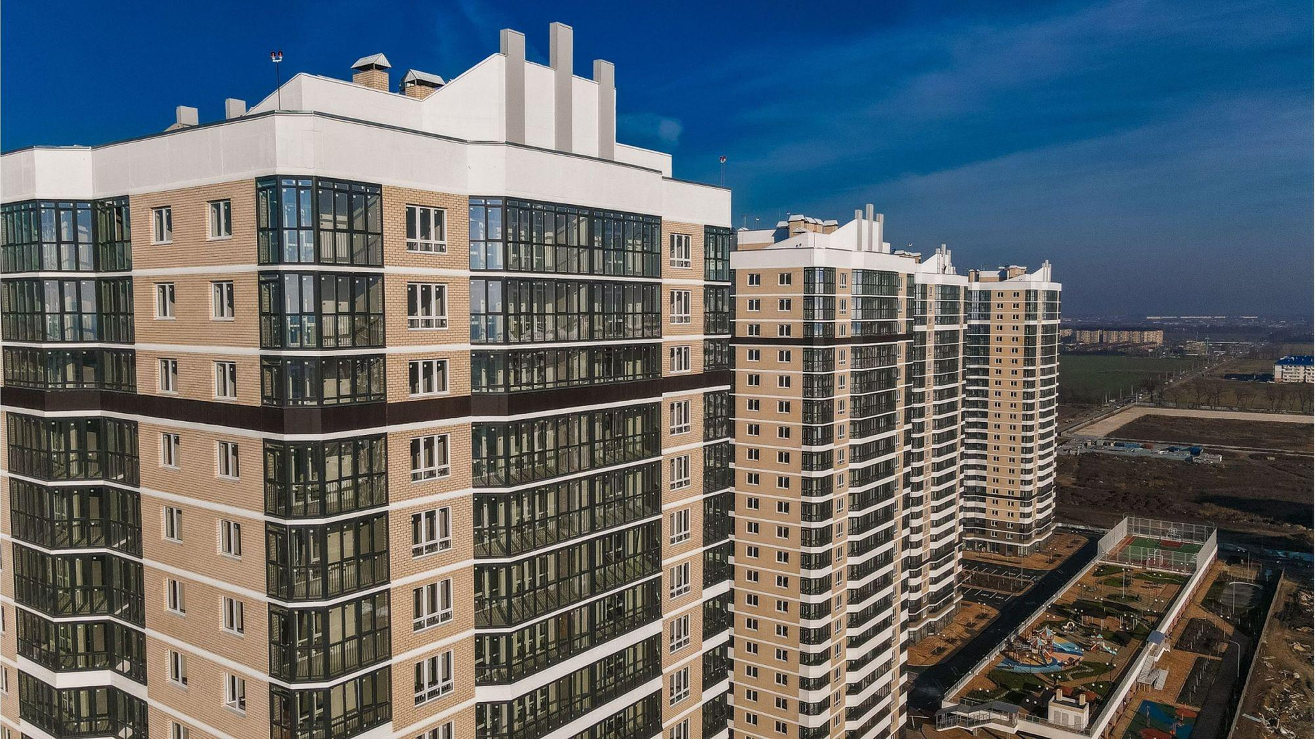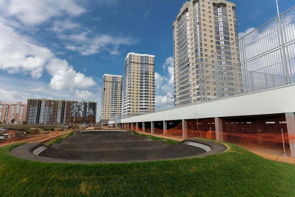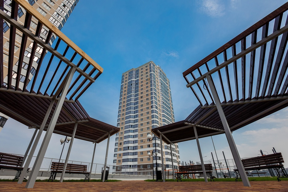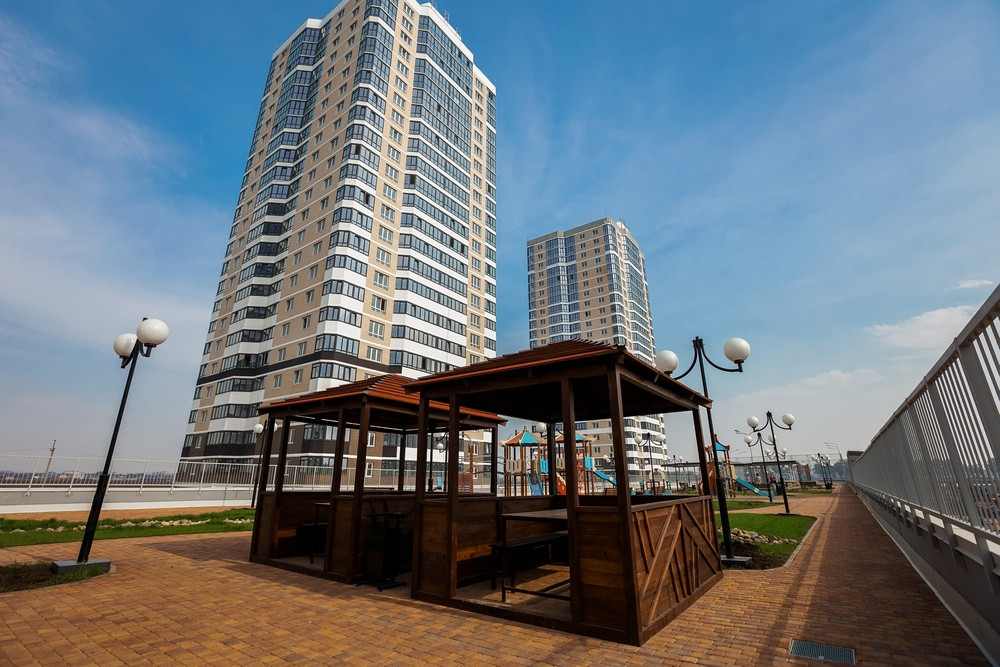 Возле домов обустроены зоны отдыха, представленные местами для барбекю и беседками. На крыше зданий сделаны детские и спортивные объекты.