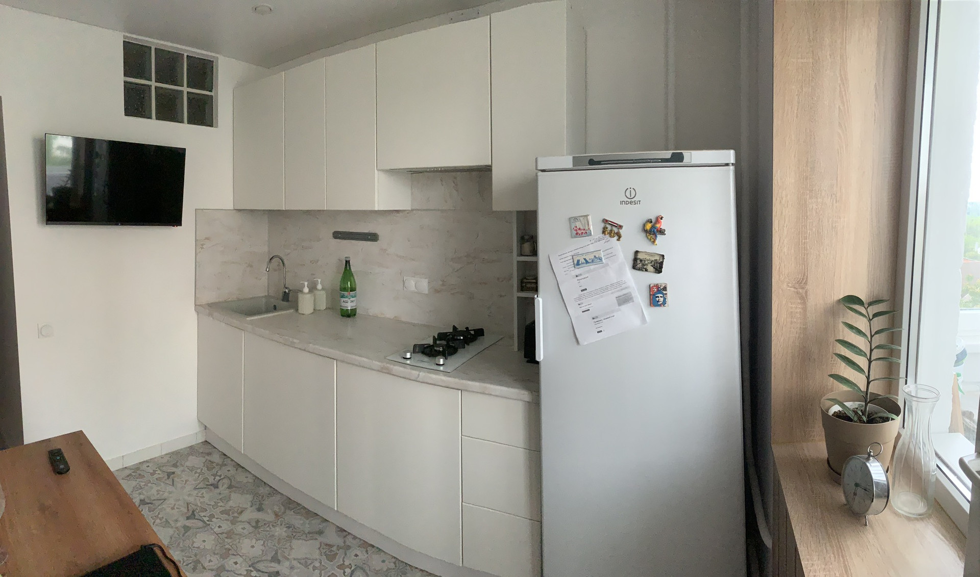 Кухня - керамогранит на полу, стены окрашены.
