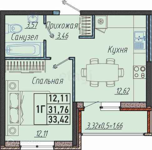 Общая площадь 33.4 м2
