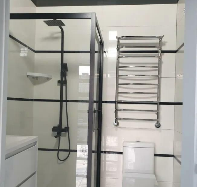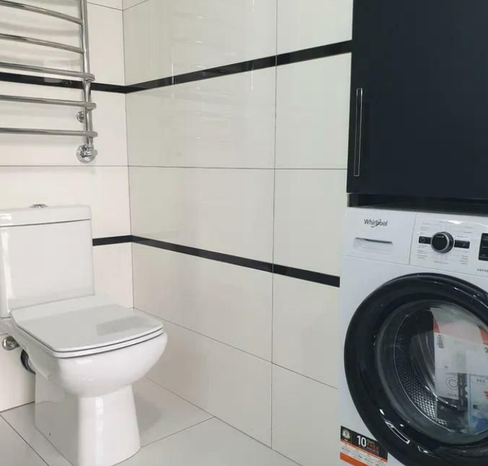 Ванная комната современная и удобная. Здесь установлены качественные сантехнические приборы и аксессуары, а также имеется стиральная машина.