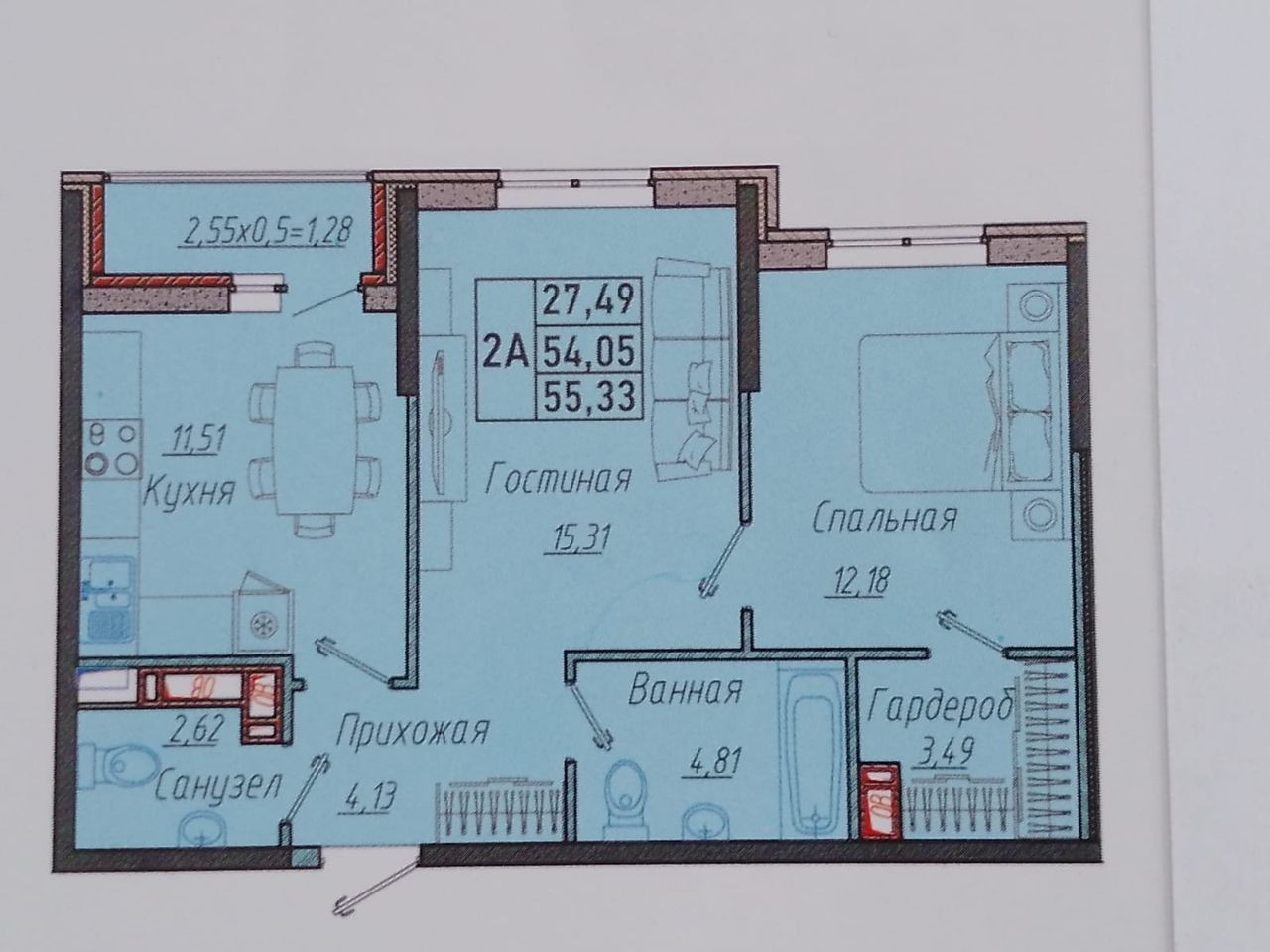 Общая площадь 55.3 м2