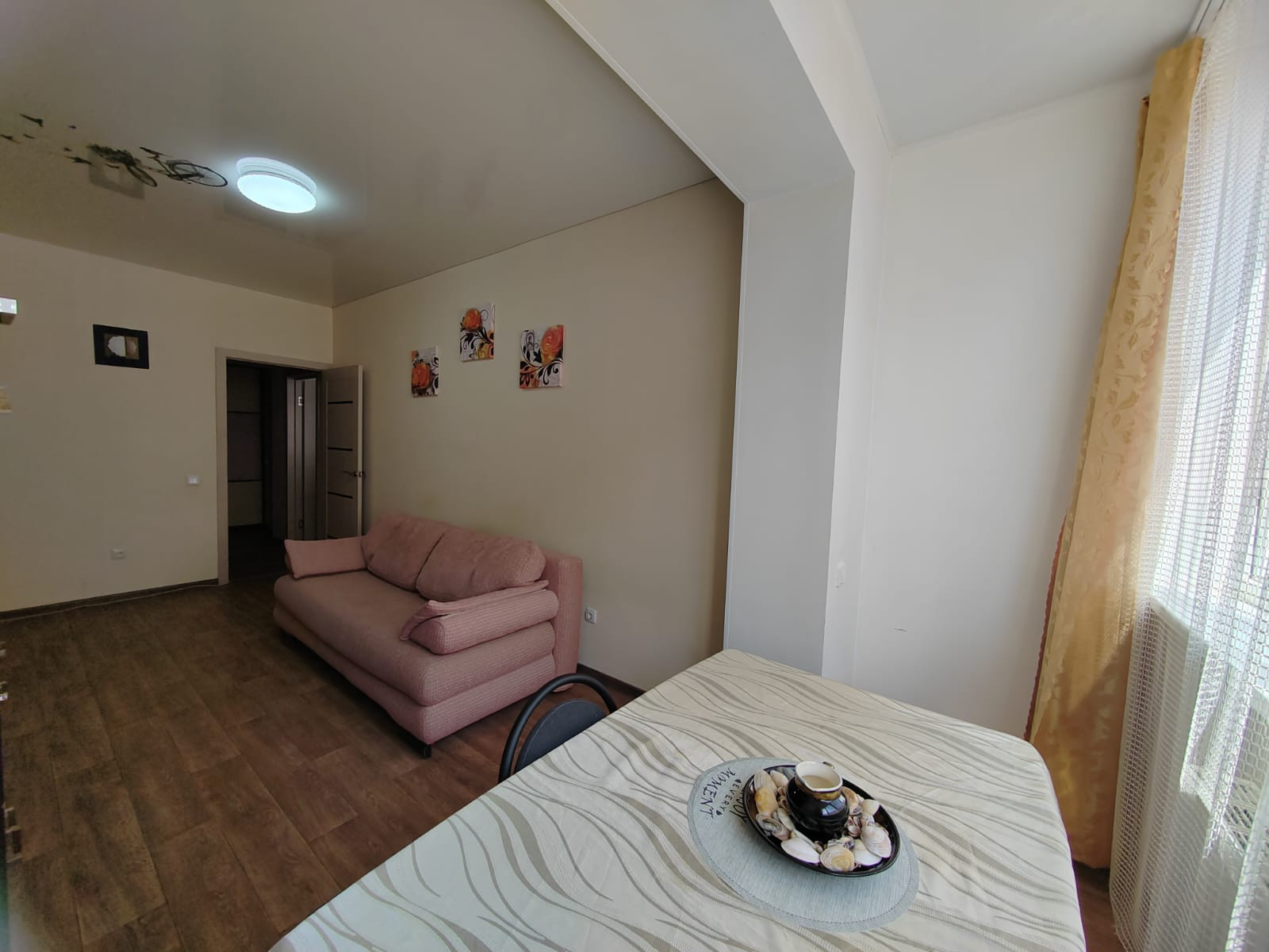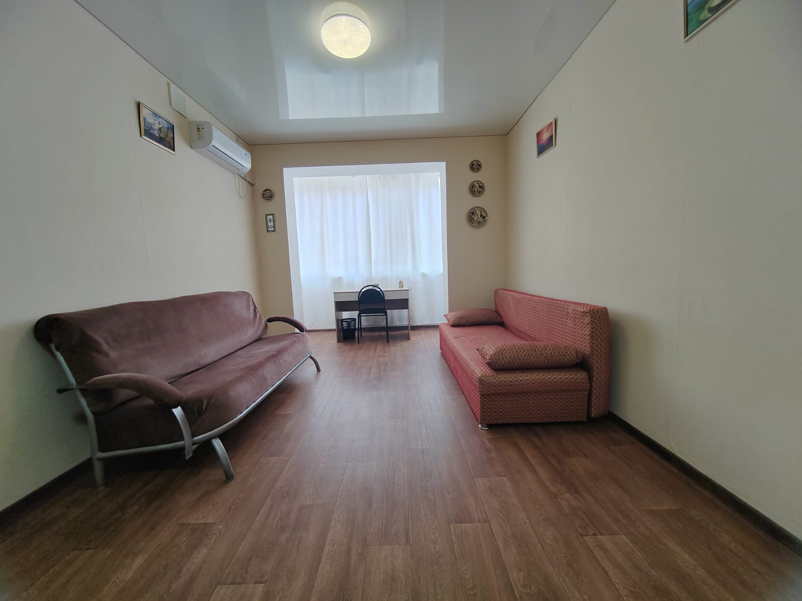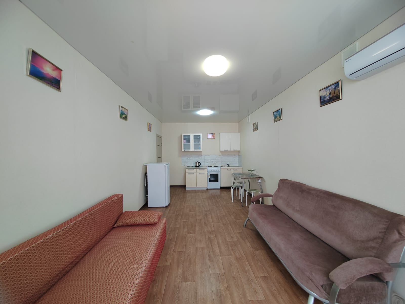 В квартире евро-планировка, она на фото. Кухня-студия (кухня+комната) 29м2 + комната 17м2, большой коридор 6,5м2 со шкафом-купе, просторный сан. узел 5м2. , он в плитке до потолка, установлена большая ванна, раковина, унитаз, бойлер. На стенах обои под покраску, натяжные потолки, на полу качественный линолеум, хорошие межкомнатные двери. В коридоре при входе плитка «Керама марацци», дорогая новая входная металлическая дверь в квартиру с качественными замками, все окна пластиковые. Удобные 3 дивана, шкаф-купе, стенка в спальне, кухонный гарнитур и обеденная зона.