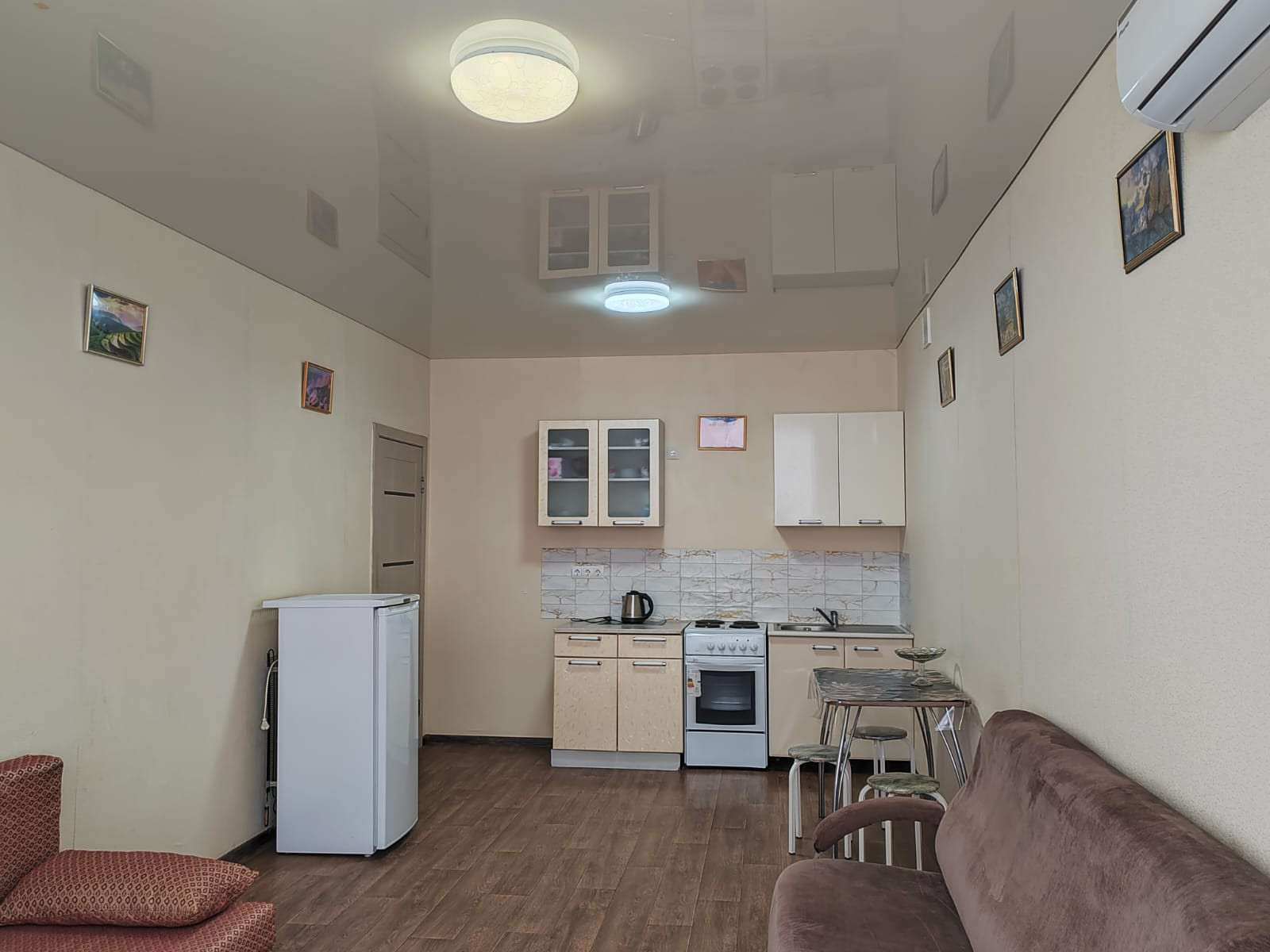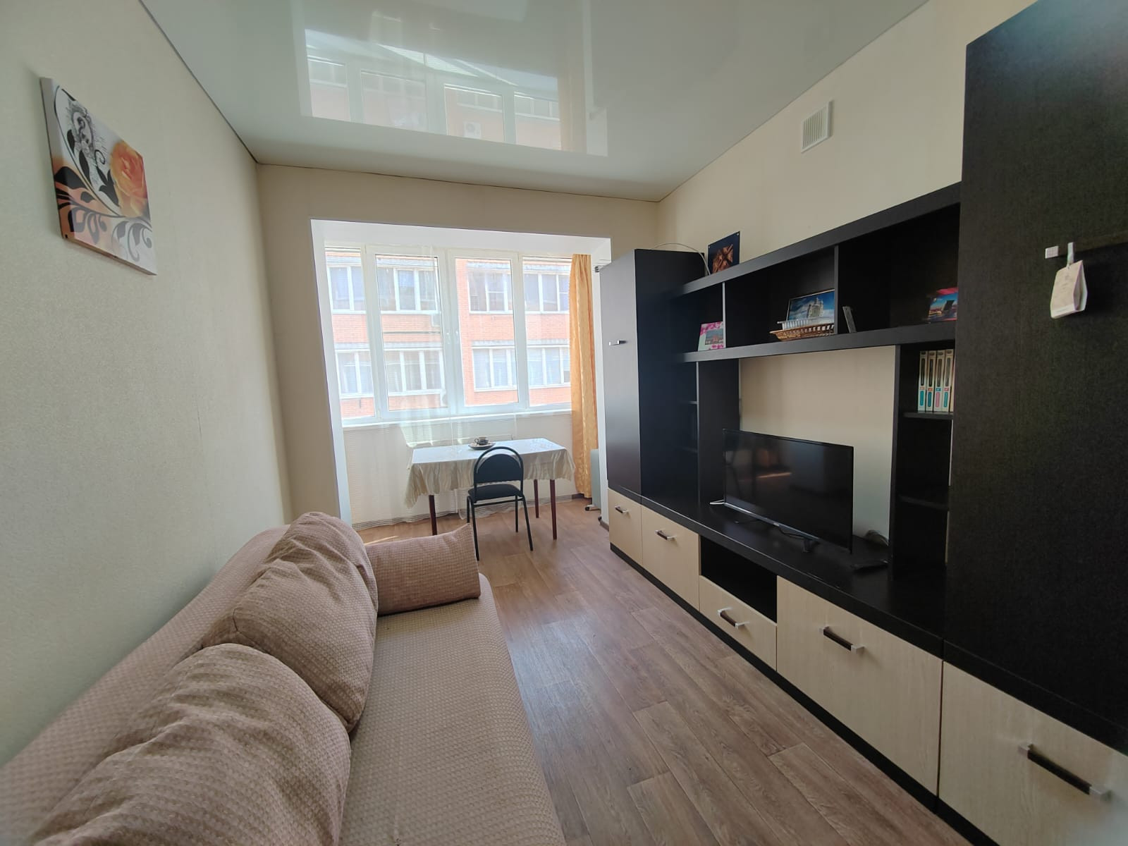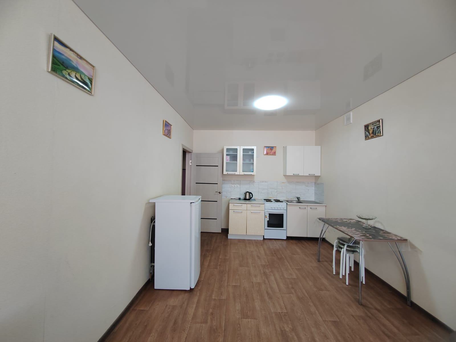 В квартире евро-планировка, она на фото. Кухня-студия (кухня+комната) 29м2 + комната 17м2, большой коридор 6,5м2 со шкафом-купе, просторный сан. узел 5м2. , он в плитке до потолка, установлена большая ванна, раковина, унитаз, бойлер. На стенах обои под покраску, натяжные потолки, на полу качественный линолеум, хорошие межкомнатные двери. В коридоре при входе плитка «Керама марацци», дорогая новая входная металлическая дверь в квартиру с качественными замками, все окна пластиковые. Удобные 3 дивана, шкаф-купе, стенка в спальне, кухонный гарнитур и обеденная зона.