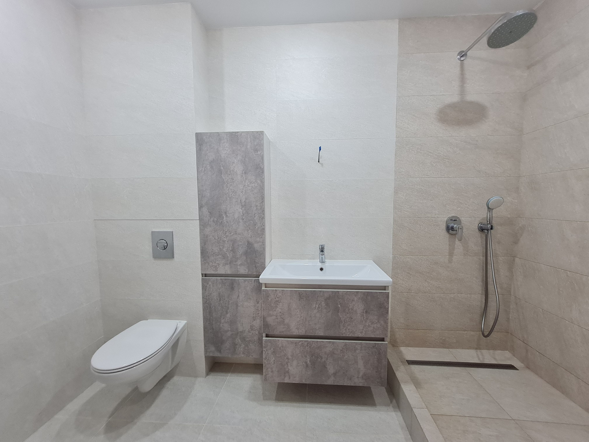 +санузел в керамограните, коммуникации спрятаны потайной люк, выложен душевой поддон, сантехника фирмы Grohe.