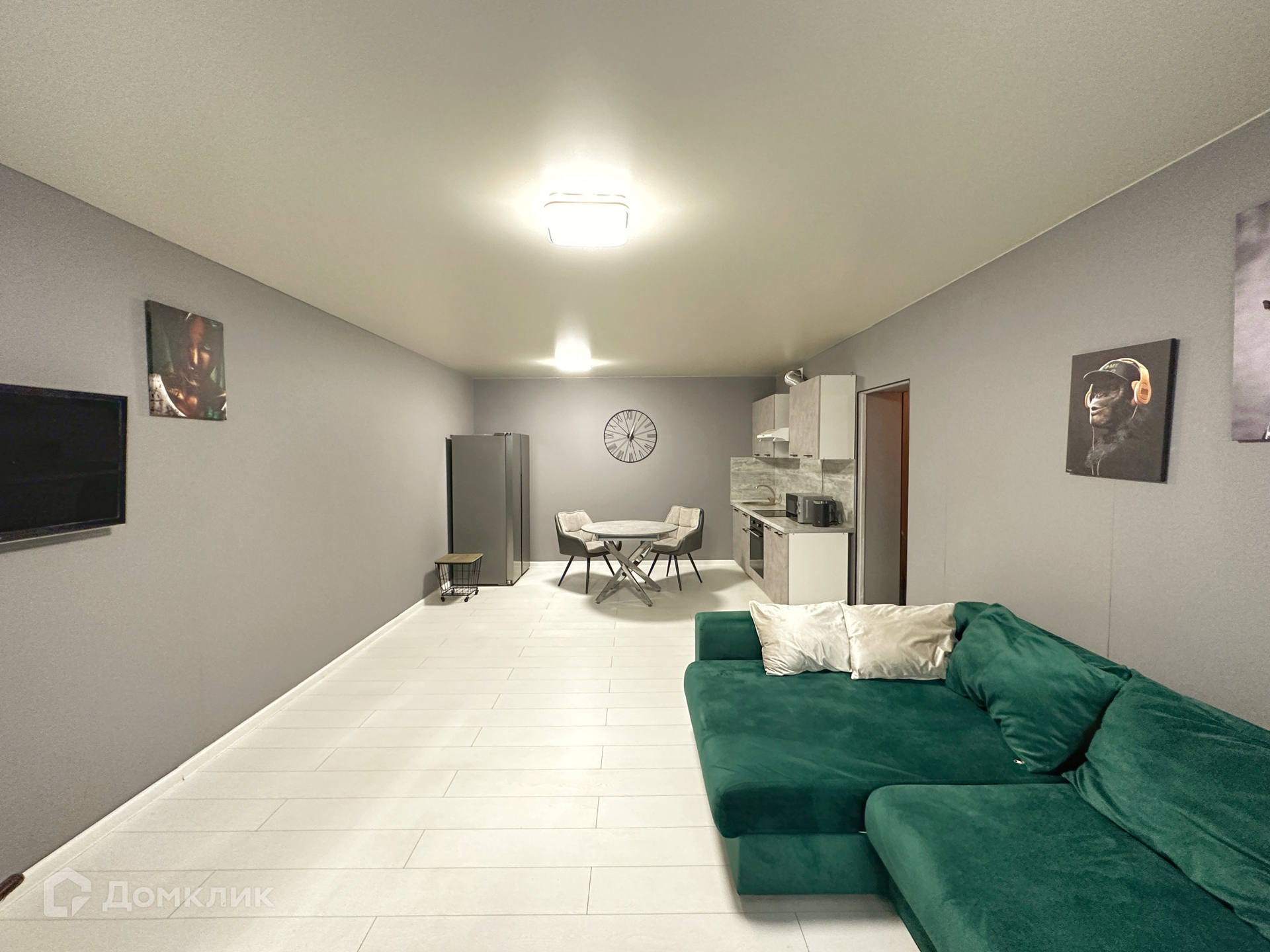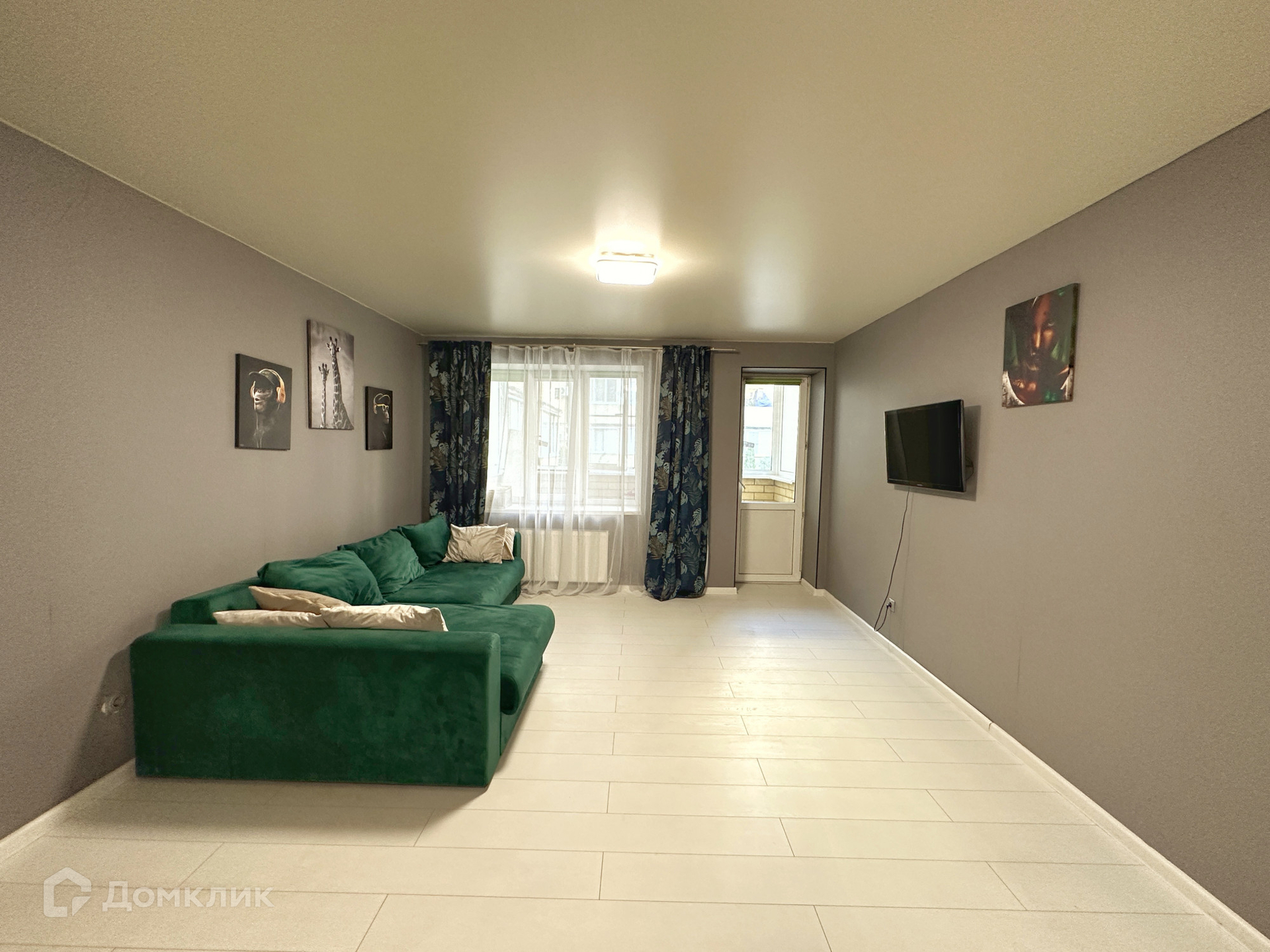 Большая и просторная комната в которой идеально разместились спальня и зона гостиной, с большим диваном и телевизором на стене.