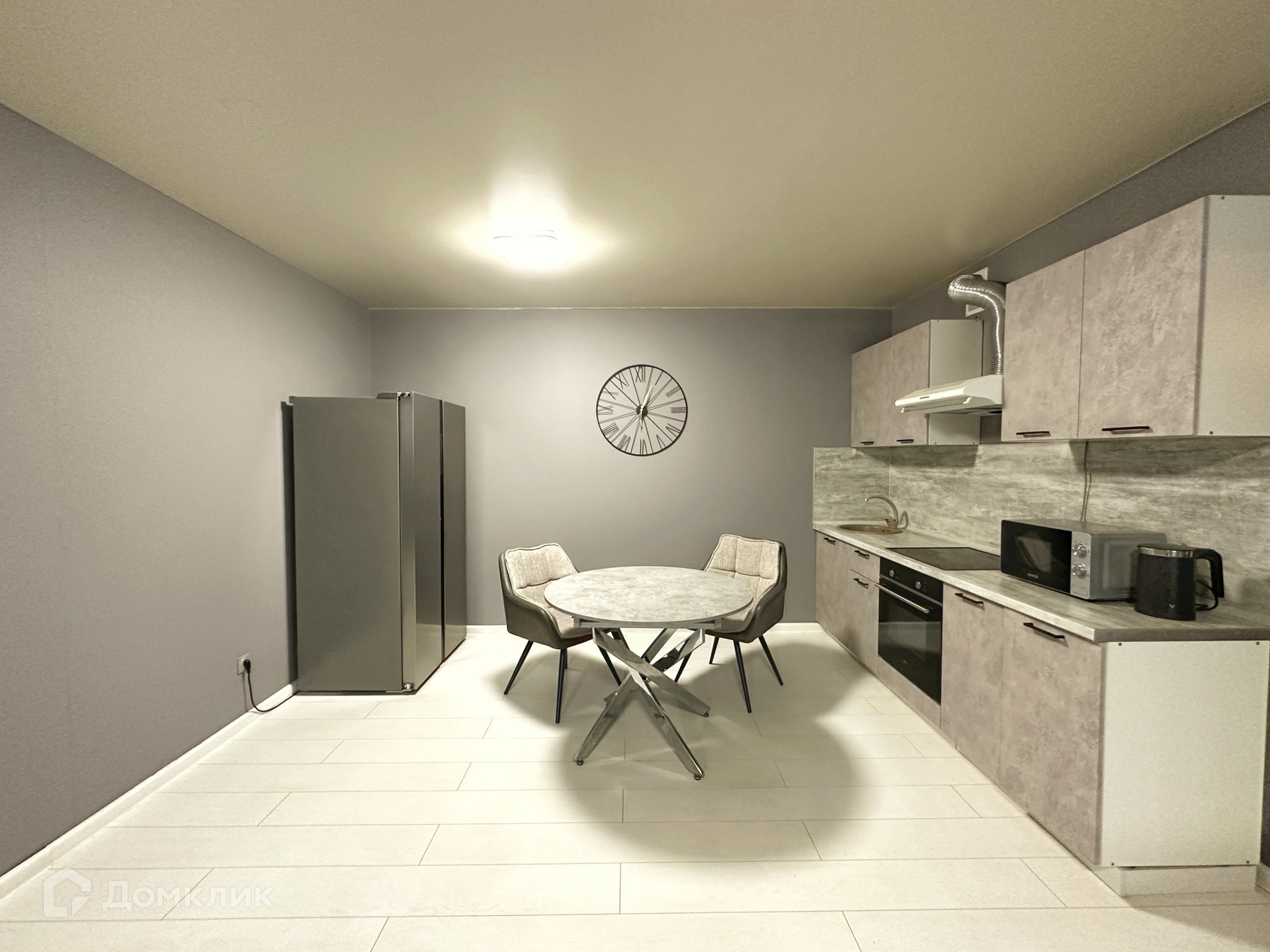 Отдельно есть большое пространством для кухни, где расположены холодильник, кухонный гарнитур, духовой шкаф, электрическая плита и обеденная зона со столом и стульями.