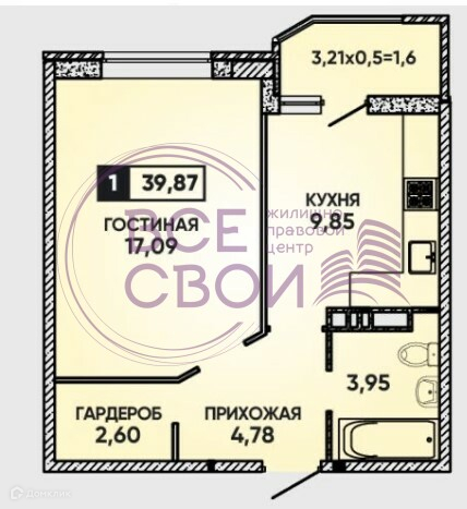 1-комнатная квартира, 39.87 м2, этаж 8 / 18, на продажу в Краснодаре, улица им. Героя Яцкова И.В., 9к1