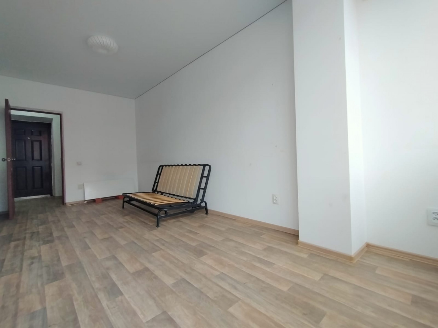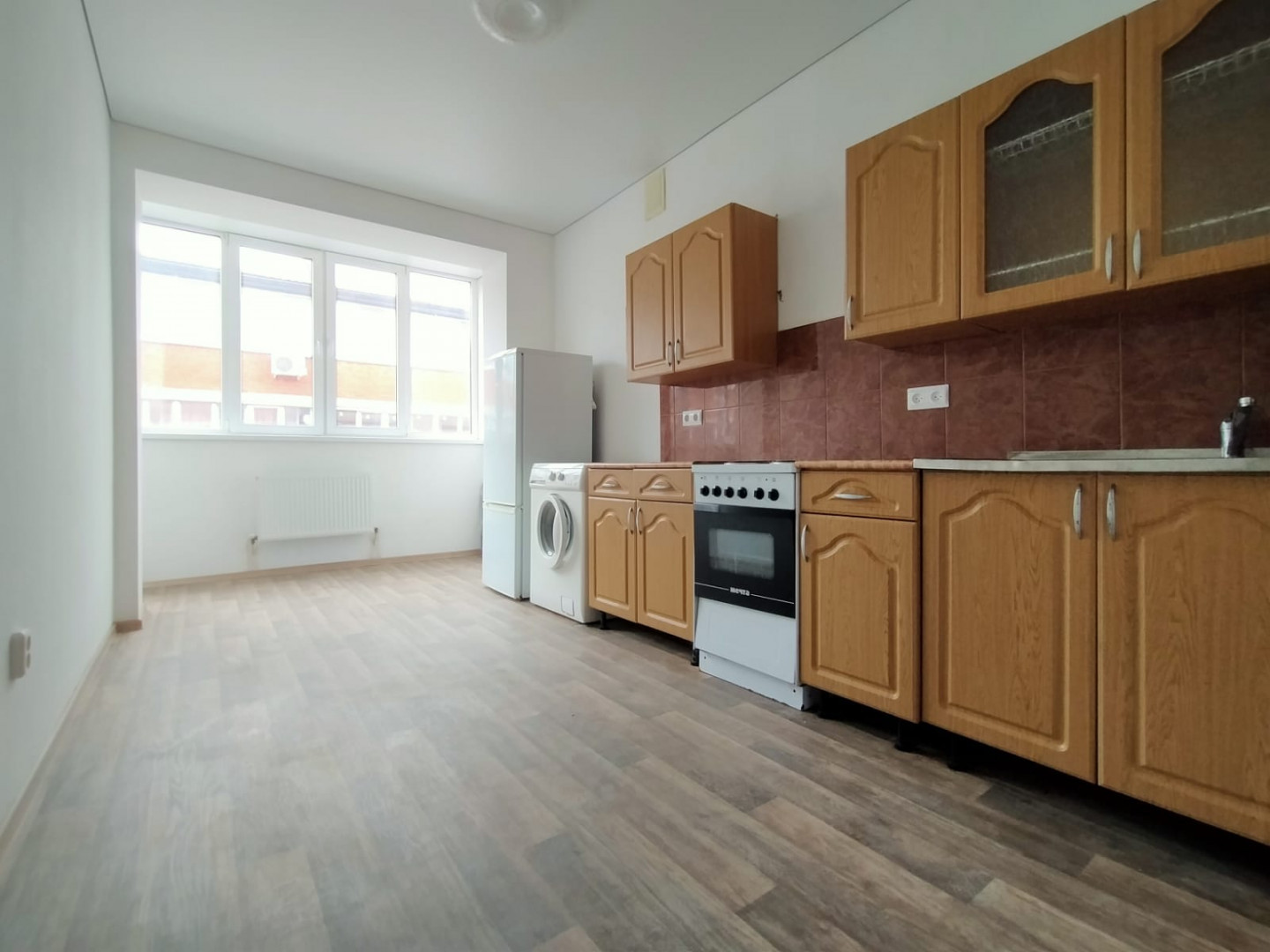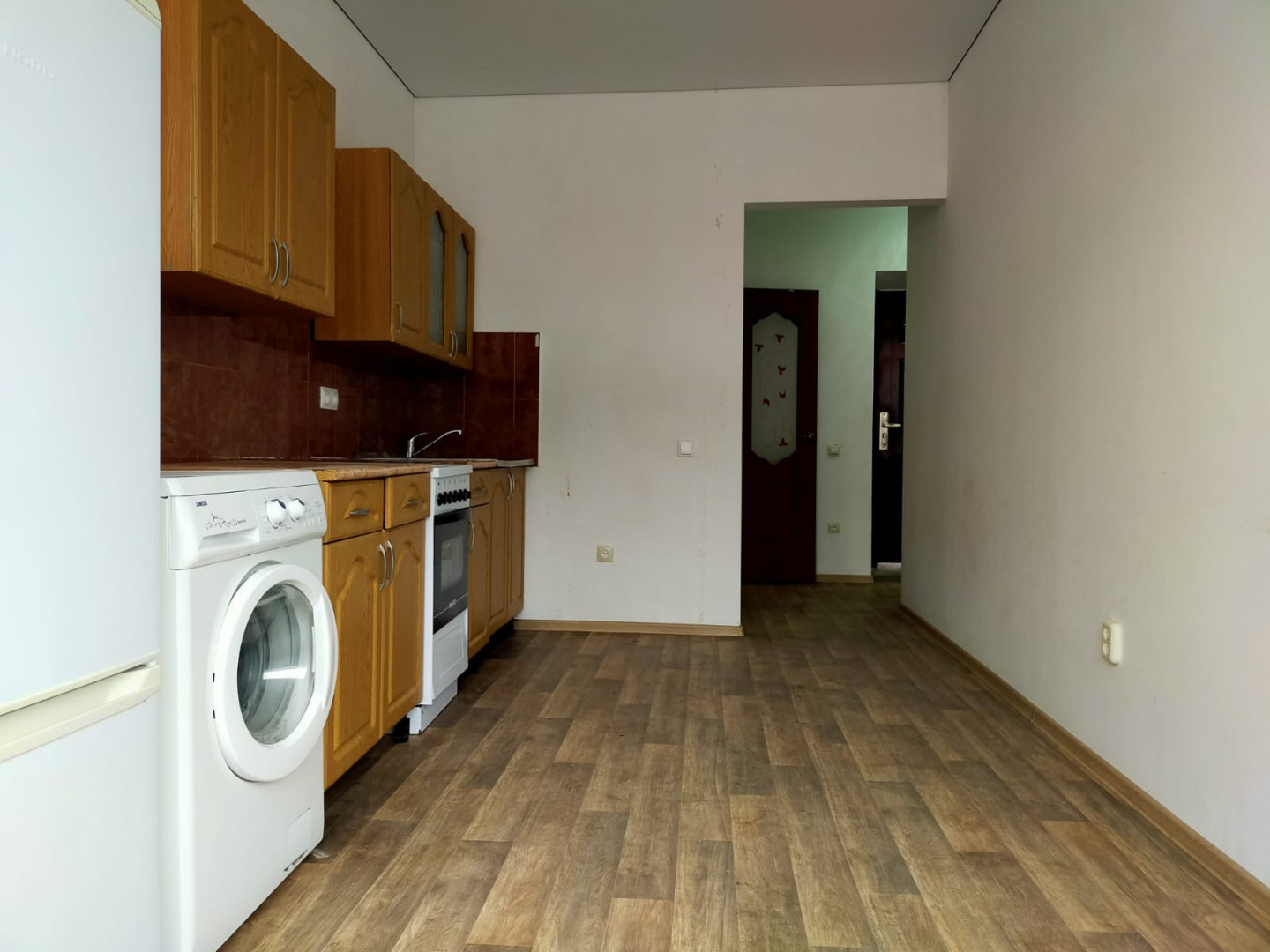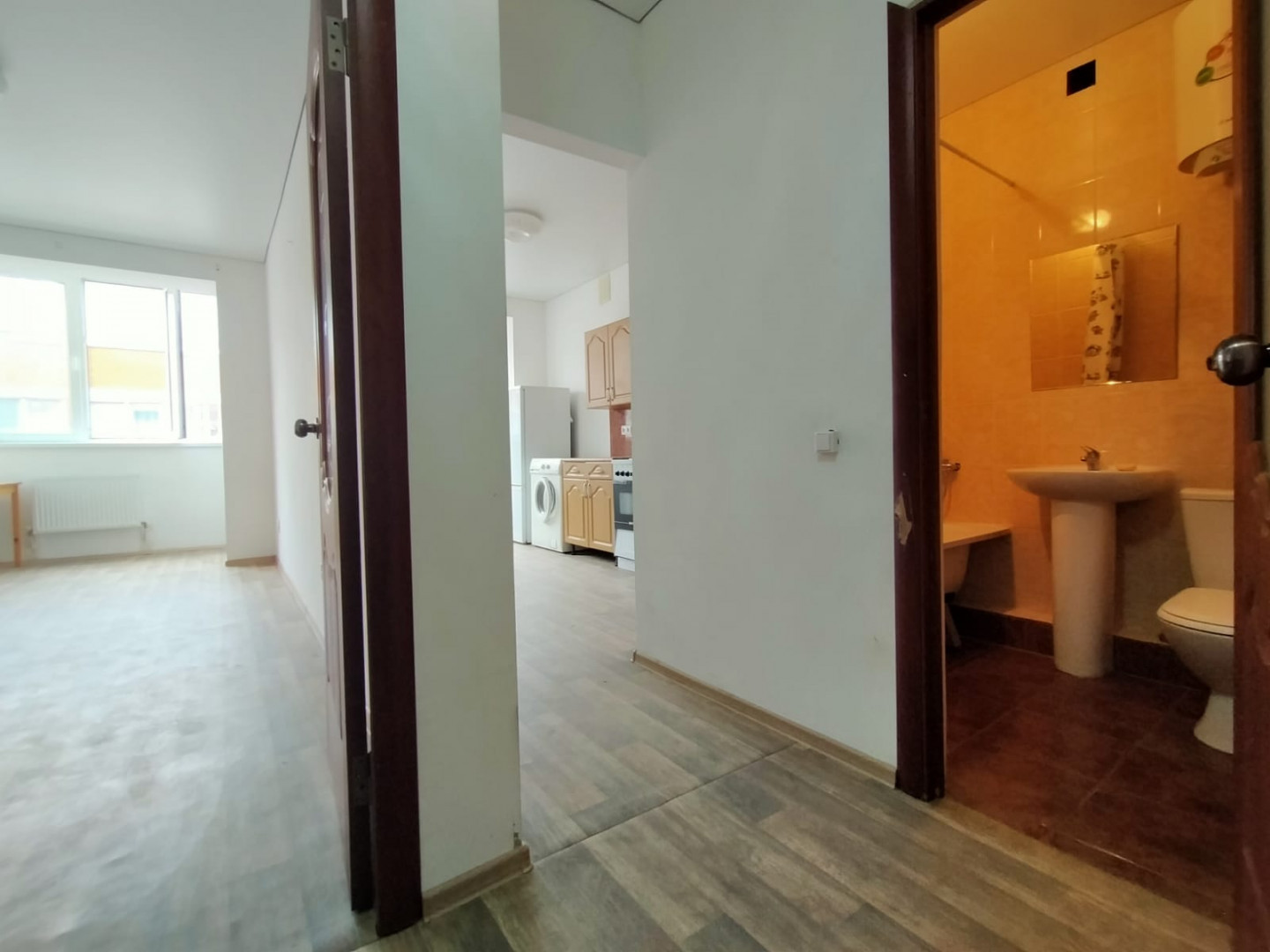 Стены окрашены в светлый цвет. Потолок натяжной по всей квартире. Частично меблированная - остается кухня, холодильник, стиральная машина, водонагреватель, жалюзи на все окна, вся сантехника, раковина, ванная, унитаз, диван кровать.