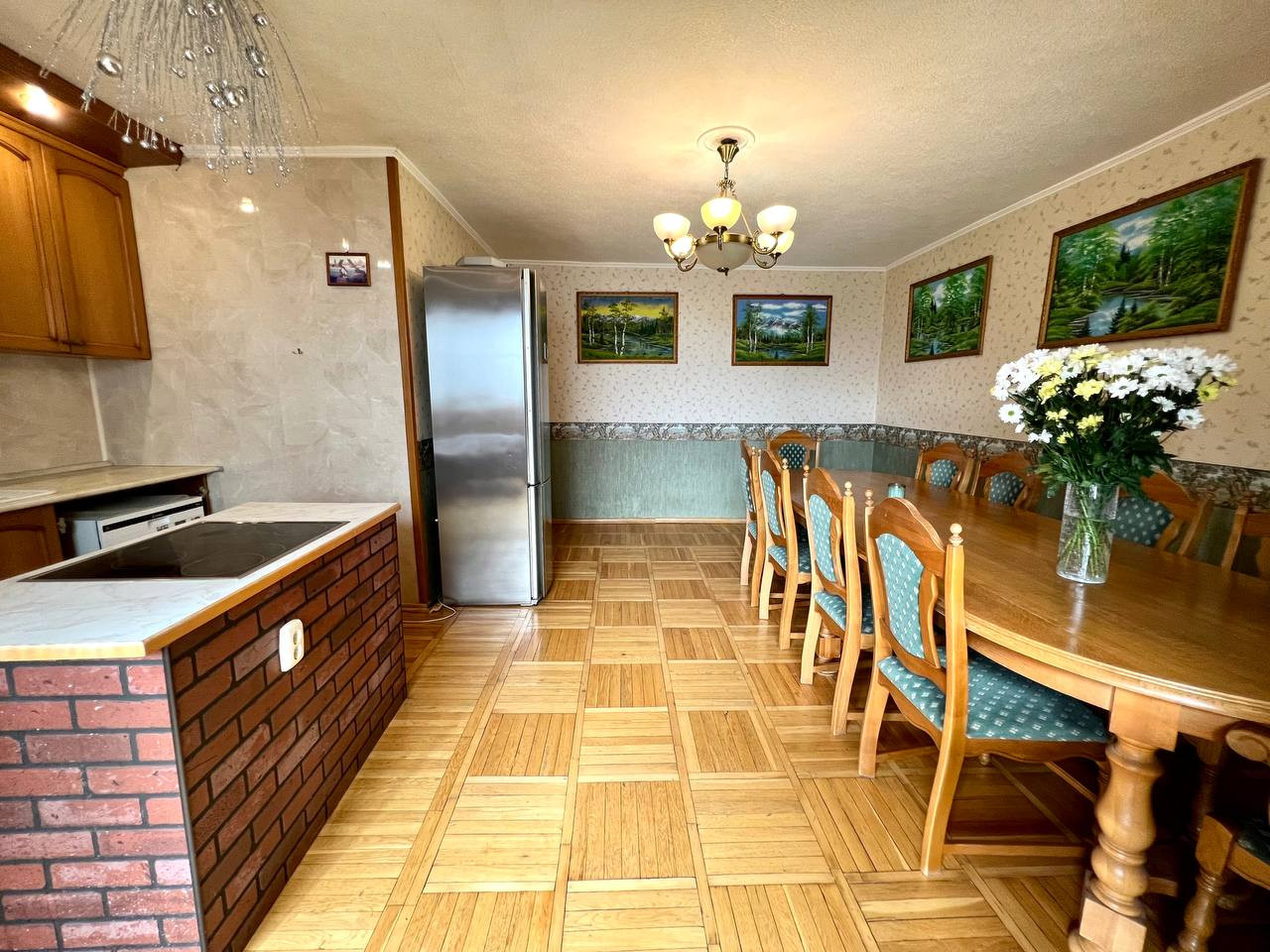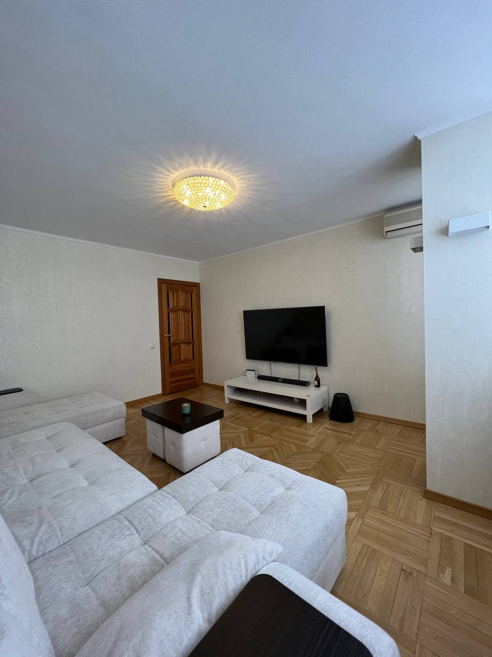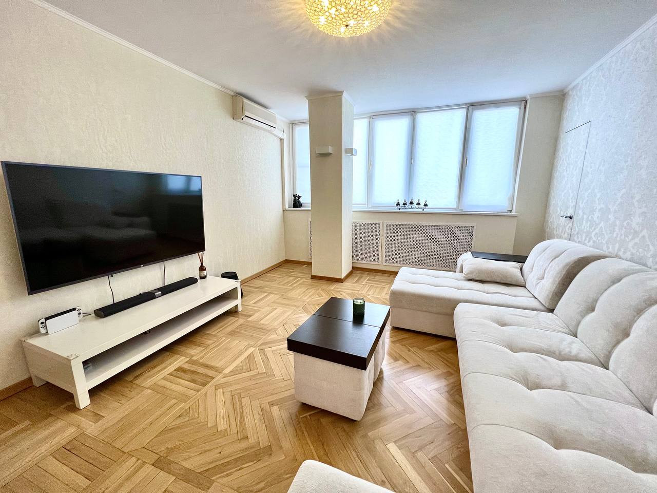 По всей квартире паркет ДУБ, кроме ванной (плитка) и коридора (плитка+тёплый пол). Во всех комнатах (включая кухню) стоят сплит-системы Samsung. Лифты в доме новые.