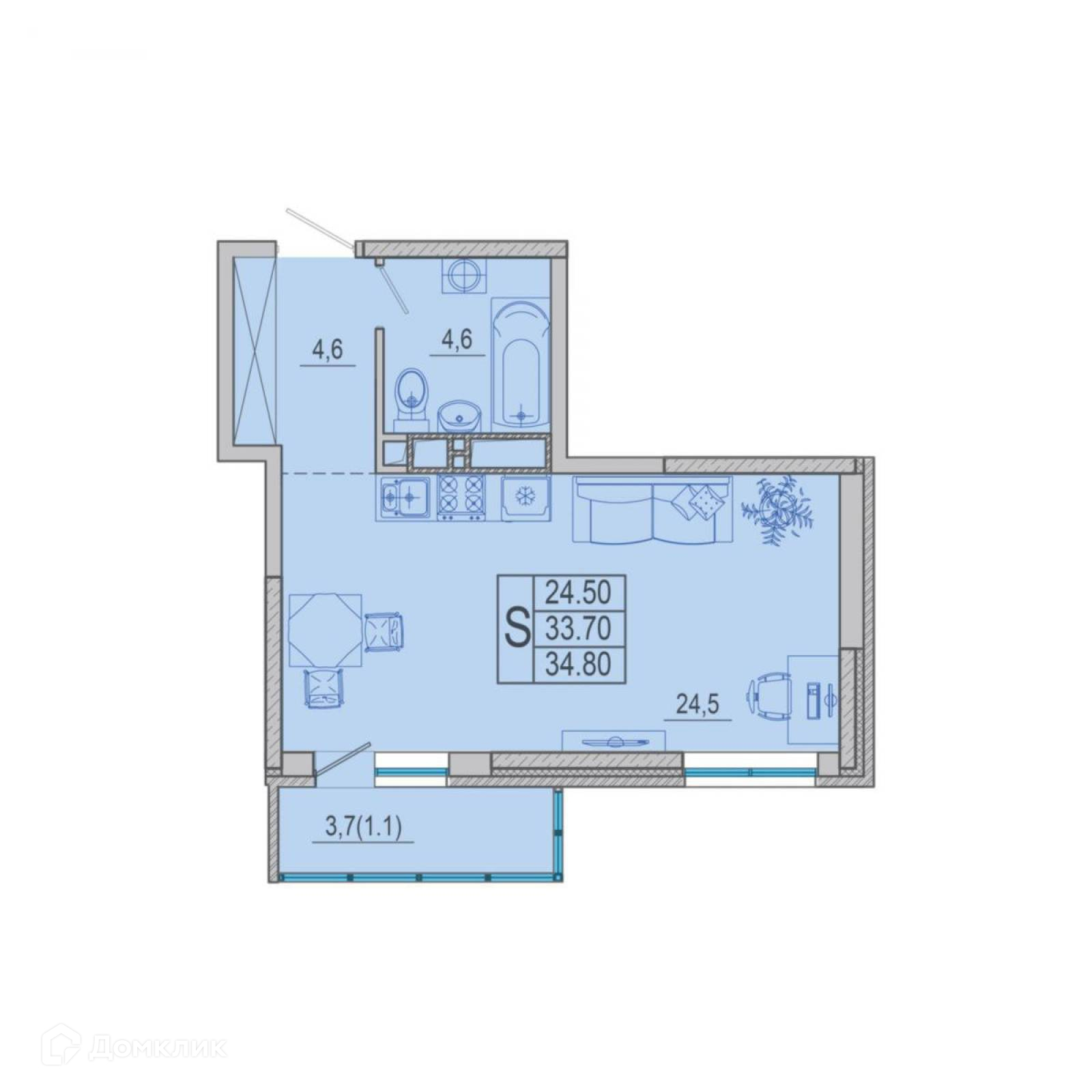 Общая площадь 33.8 м2