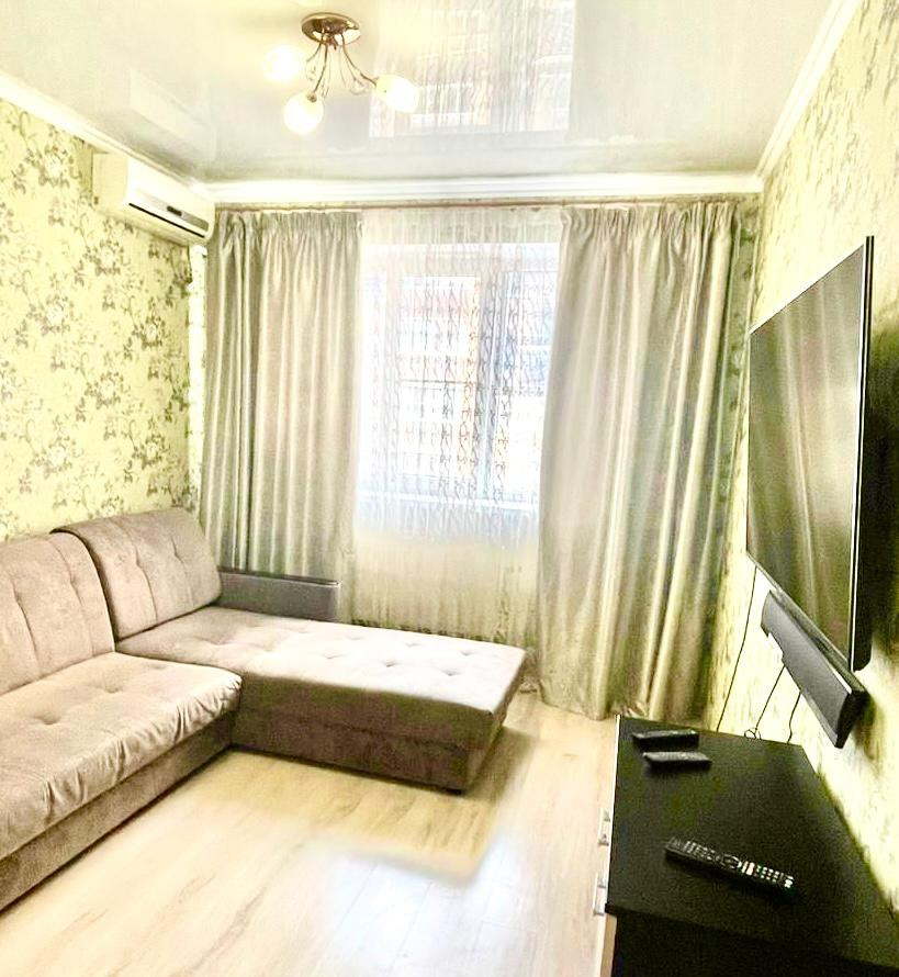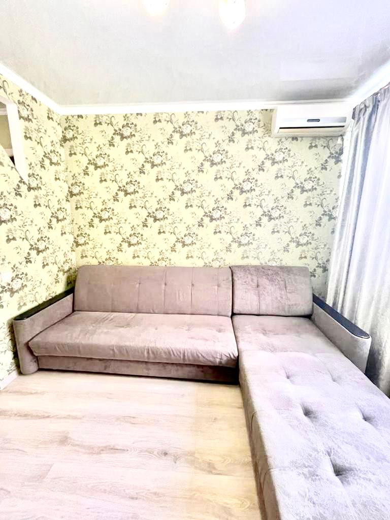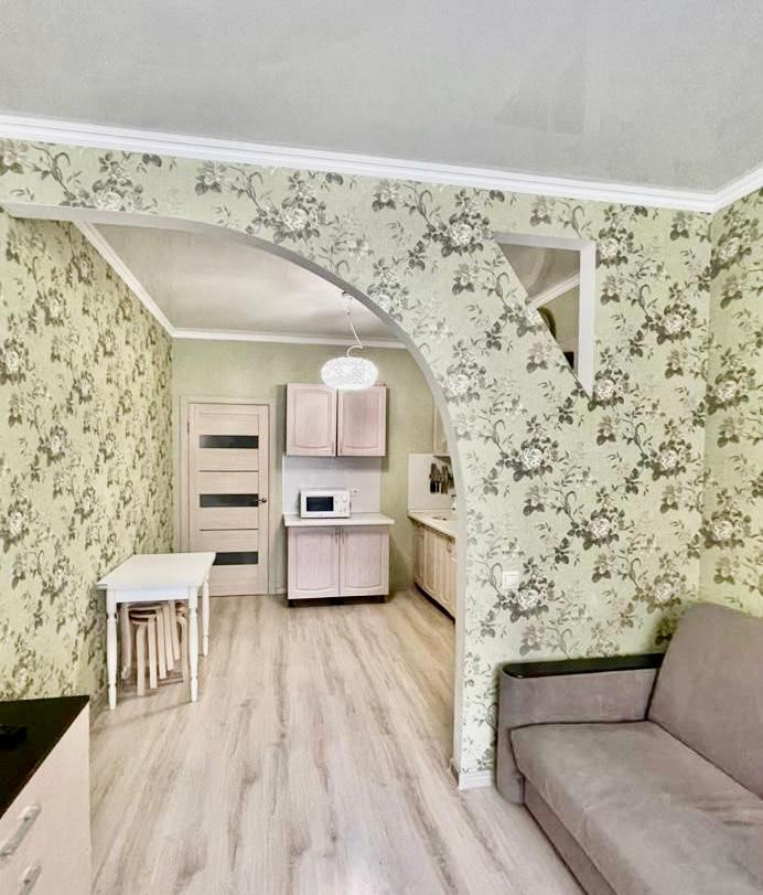 В квартире выполнен евро ремонт, на полу в комнатах ламинат, в коридоре и санузле плитка. Квартира очень уютная, теплая, солнечная и чистая. Продуманная удобная планировка в квартире: одна изолированная комната 15,3 кв.м и совмещенная с гостиной кухня - 19,2 кв.м.   (кухонная зона отделена от гостиной полуаркой из гипсокартона), коридор 8 кв.м, санузел 4кв.м. Квартира продается с мебелью и техникой представленной на фото: кондиционер, телевизор, холодильник, электрическая плита Haier ,  стиральная машина на 7 кг  .