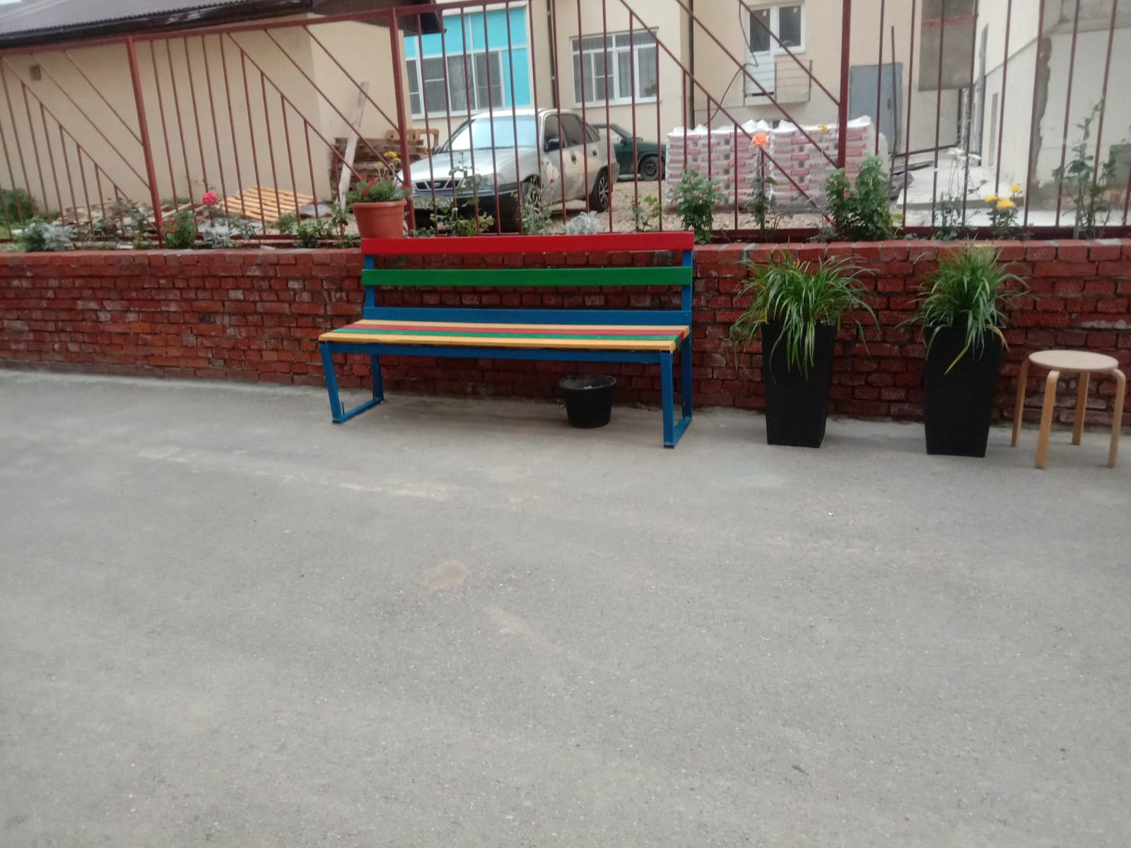 Цветы посадили во дворе, зелёную изгородь.