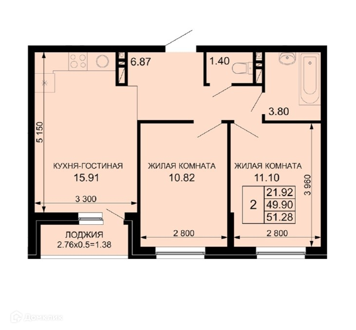 Общая площадь 51.28 м2