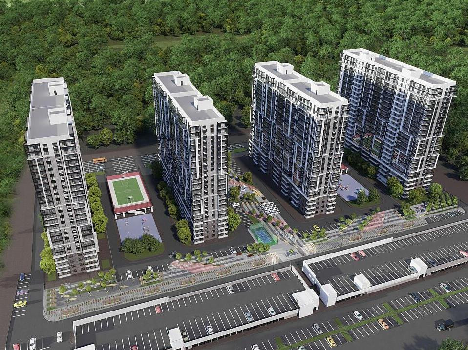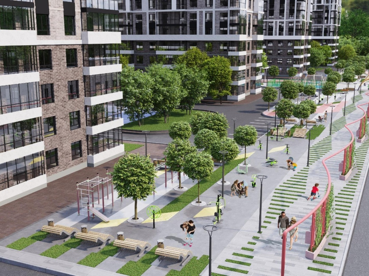 На территории оборудованы современные детские площадки, спортивные зоны и тренажеры размещены на эксплуатируемой кровле коммерческих помещений. Парковка вокруг комплекса и многоуровневая крытая, есть парковки для велосипедов, зоны отдыха с фонтанами.