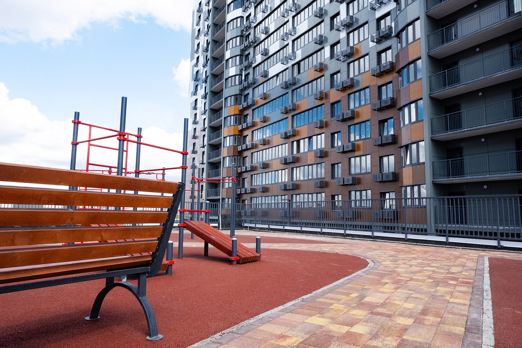 Внутренний двор оснащен современными детскими и спортивными площадками. На территории комплекса выполнено озеленение.