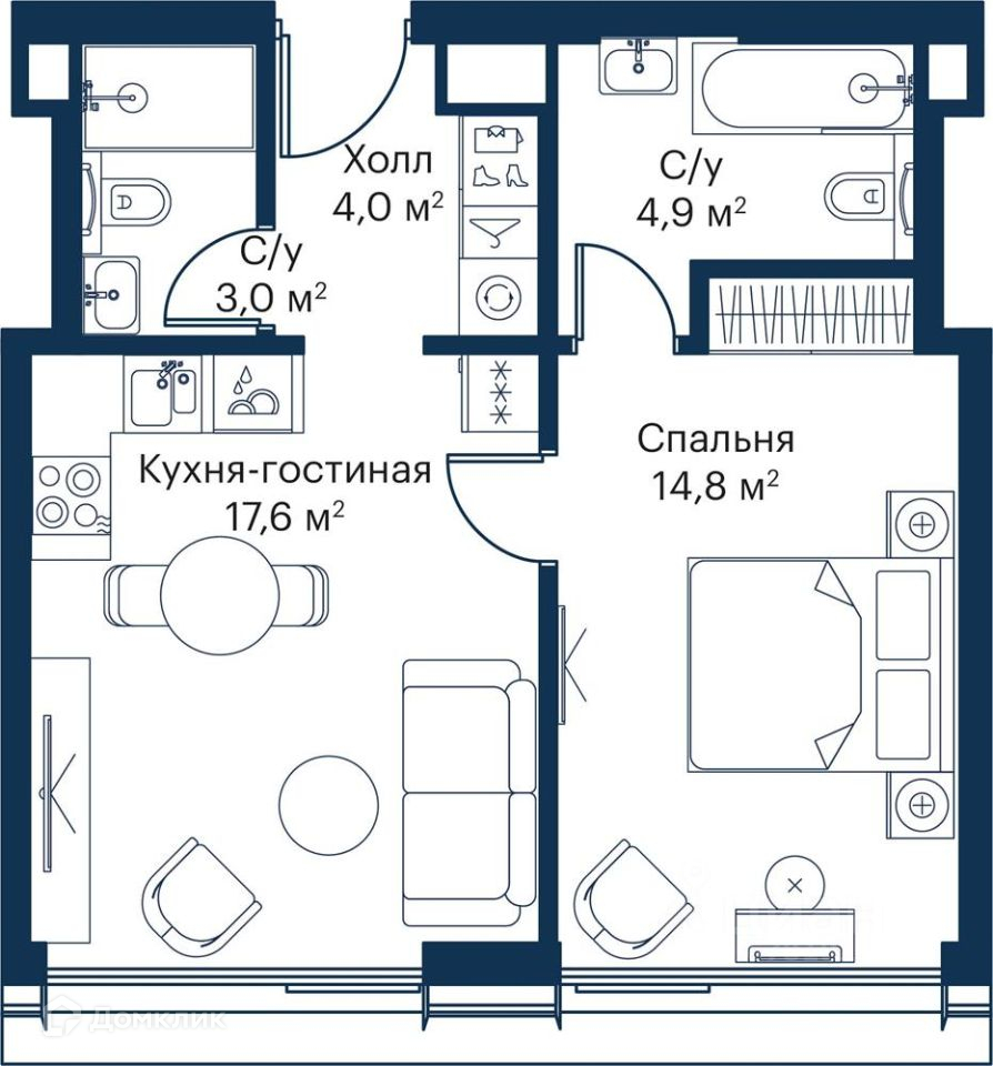 Общая площадь 44.3 м2