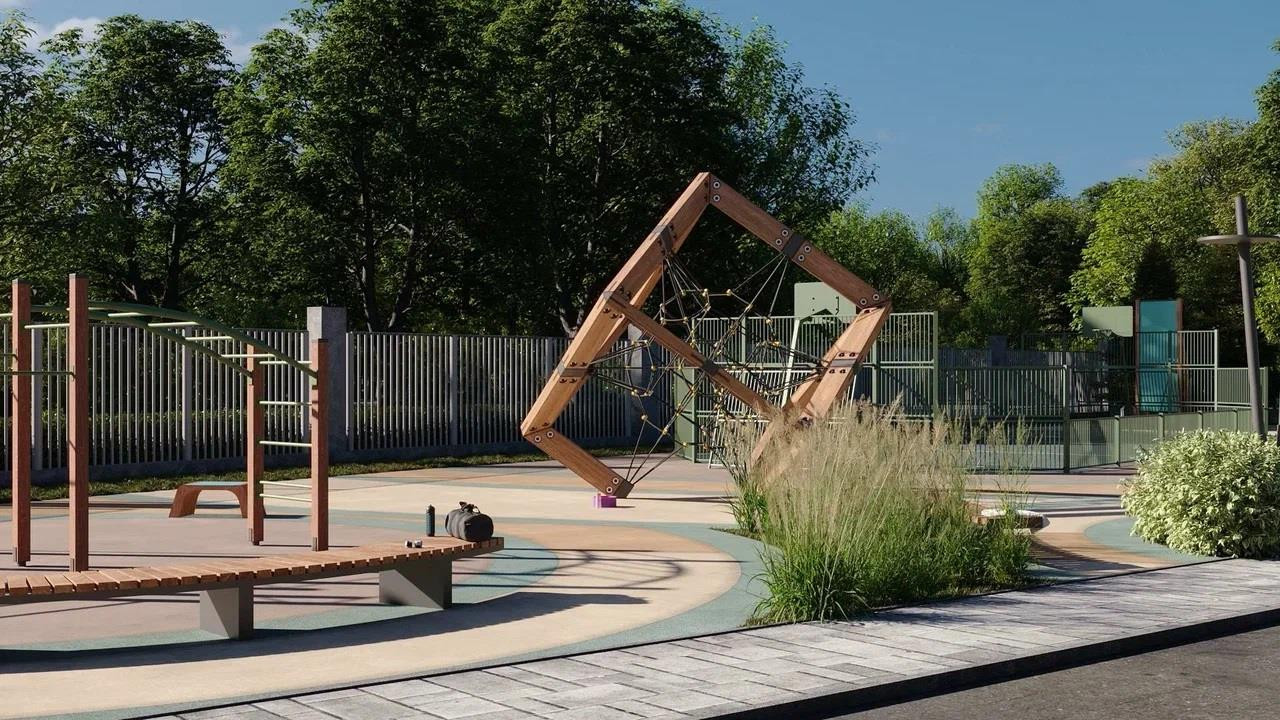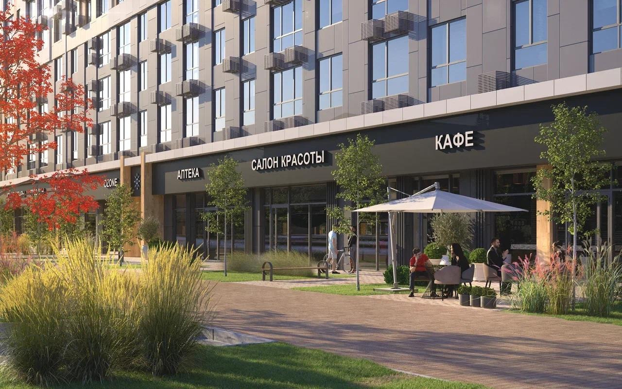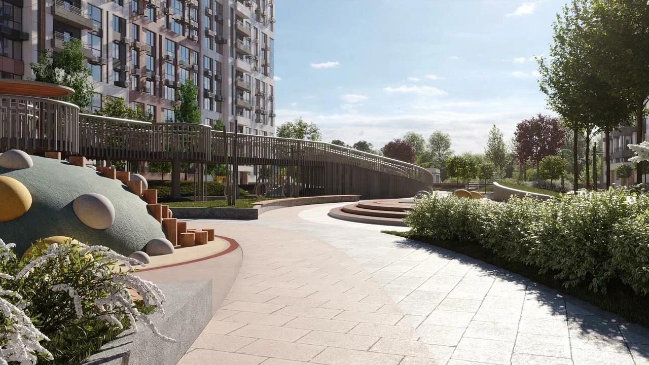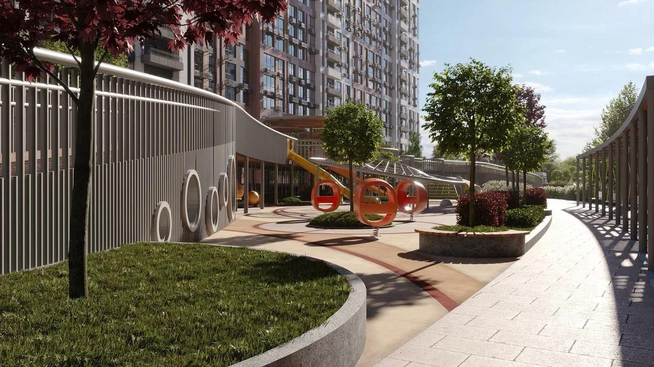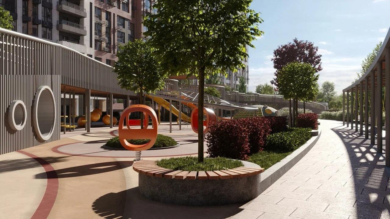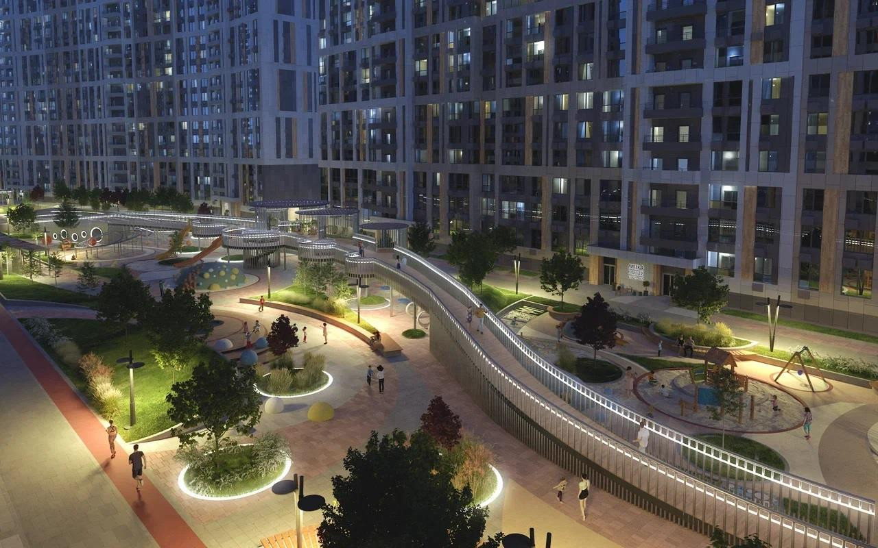 Вход на охраняемую территорию комплекса осуществляется по Face ID. На стилобате создан уникальный двор-парк с современными игровыми плейхабам и спортивными площадками. Так зона коммерческого кластера с магазинами, пунктами доставки, аптеками и кафе отделена от зоны для отдыха и прогулок. Для автовладельцев в комплексе предусмотрена многоуровневая закрытая парковка с широкими машиноместами, а также паркинг вокруг комплекса. В стилобате разместился подземный паркинг со спуском на лифте. Расчеты произведены на 2 автомобиля на человека. В шаговой доступности на территории есть своя школа и детский сад.