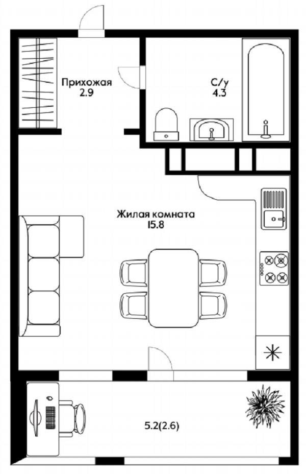 Общая площадь 25.6 м2