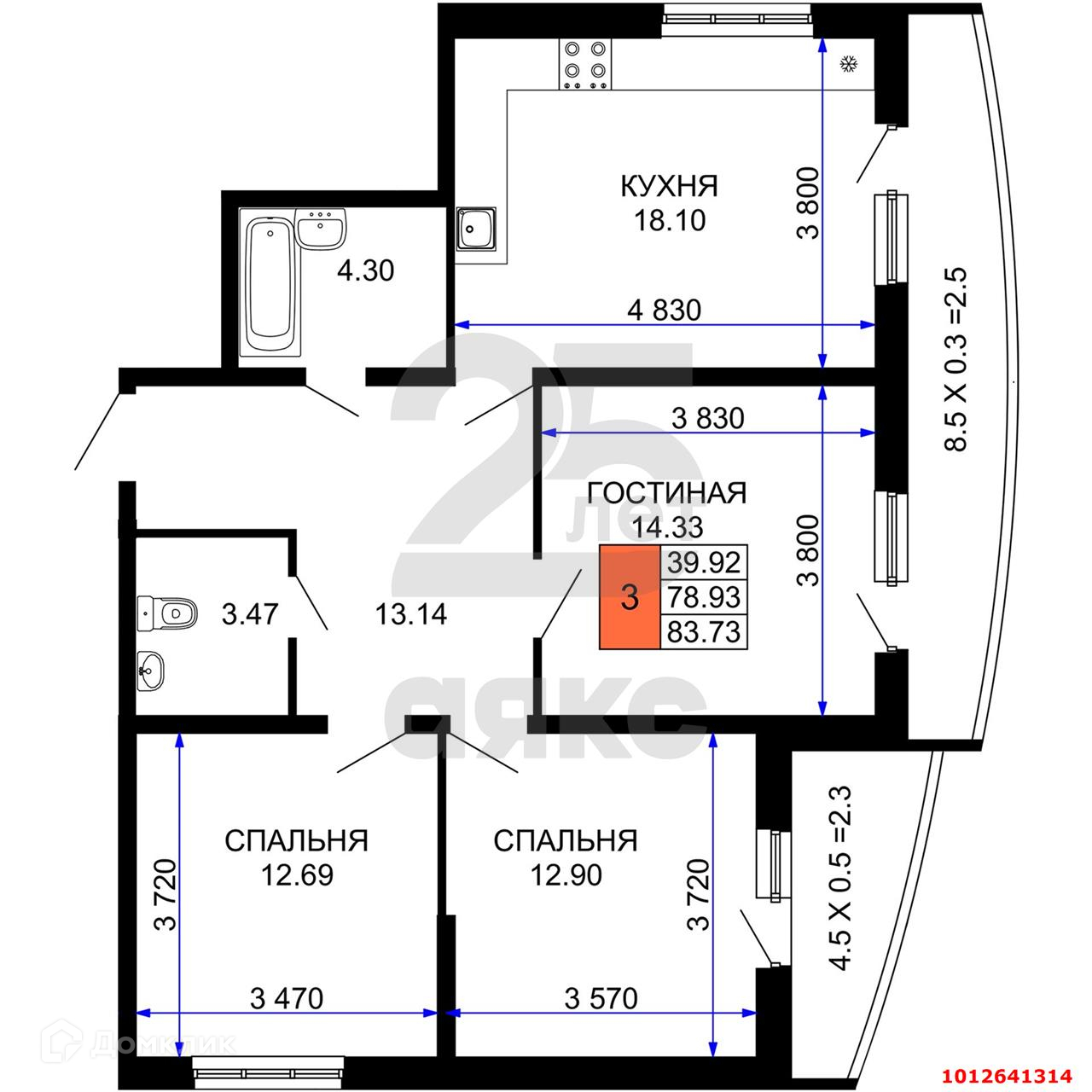 3-комнатная квартира, 92 м2, этаж 21 / 24, на продажу в Краснодаре, улица Петра Метальникова, 40
