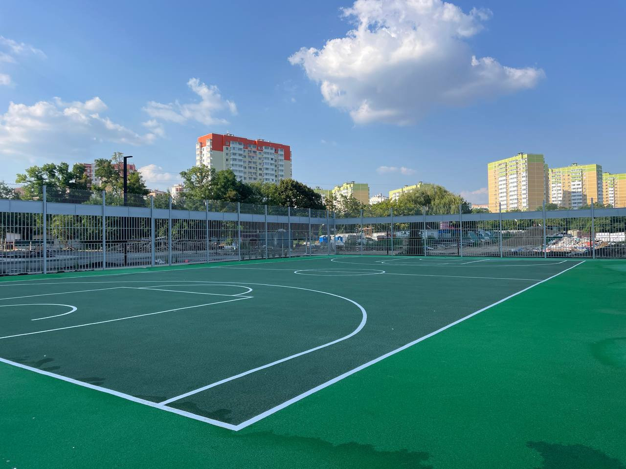 Двор с современными детскими и спортивными площадками.