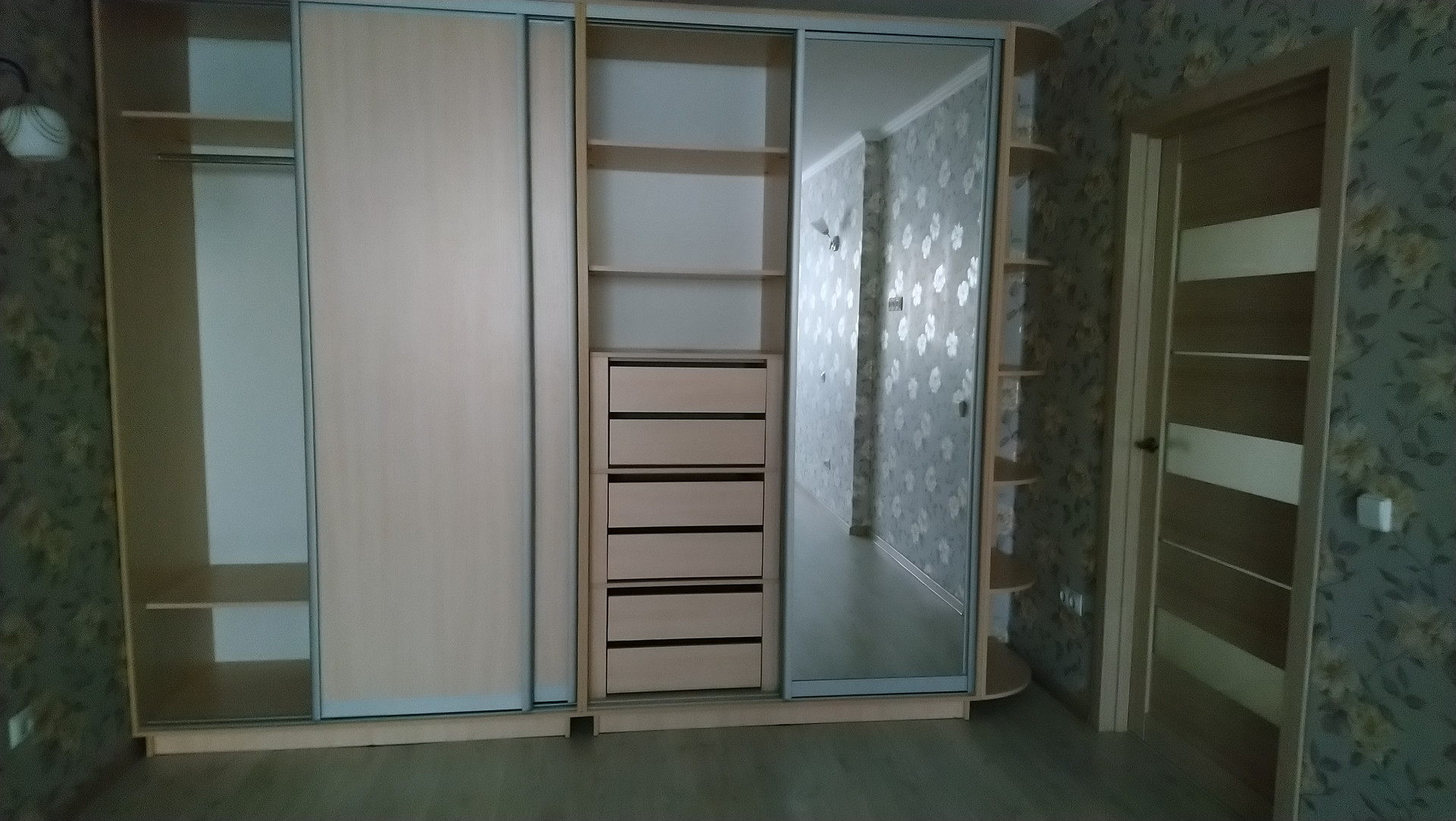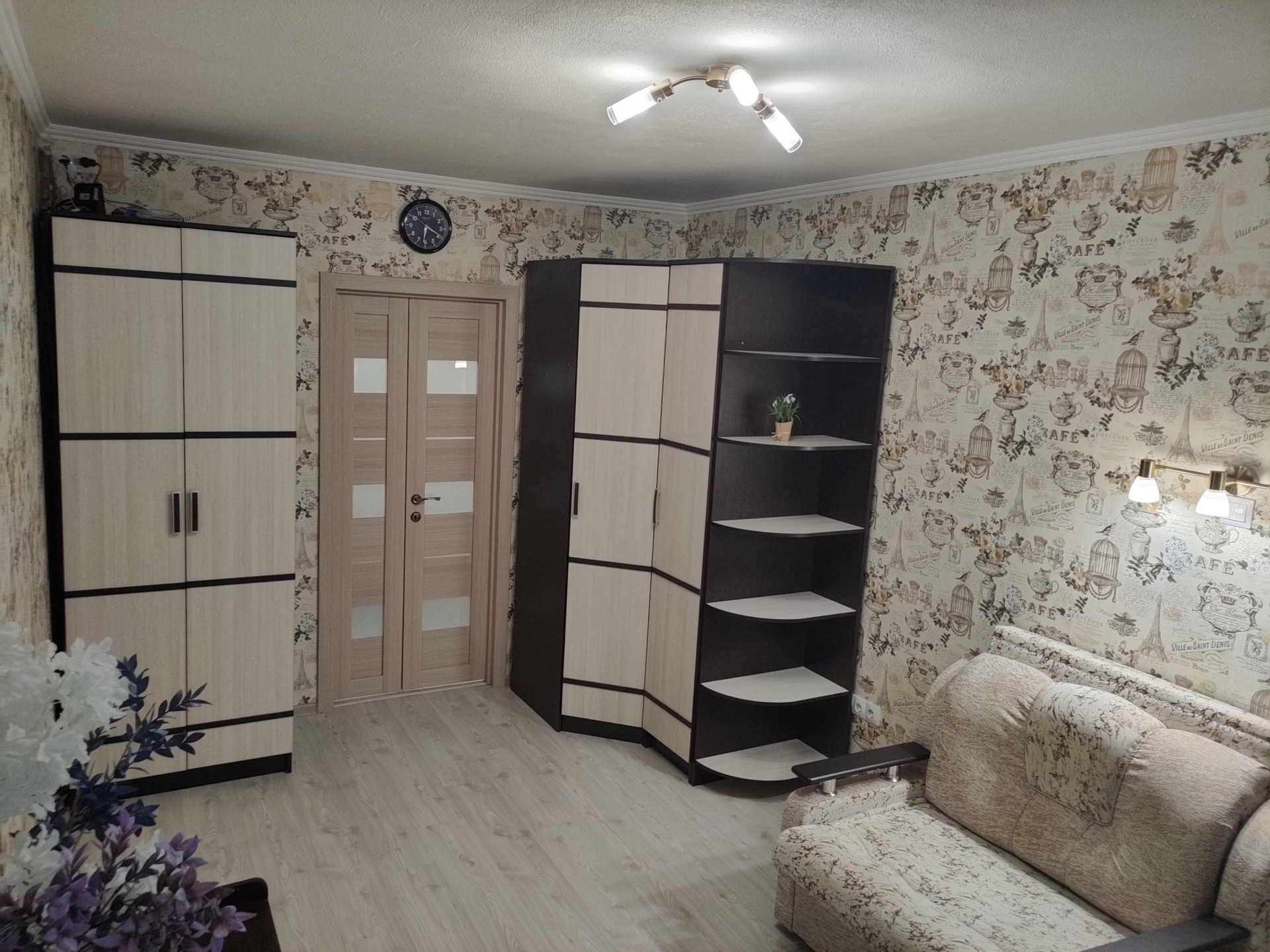 Мебель: небольшая кухня, много новых шкафов для хранения одежды, декоративный стеллаж, кресло-кровать.