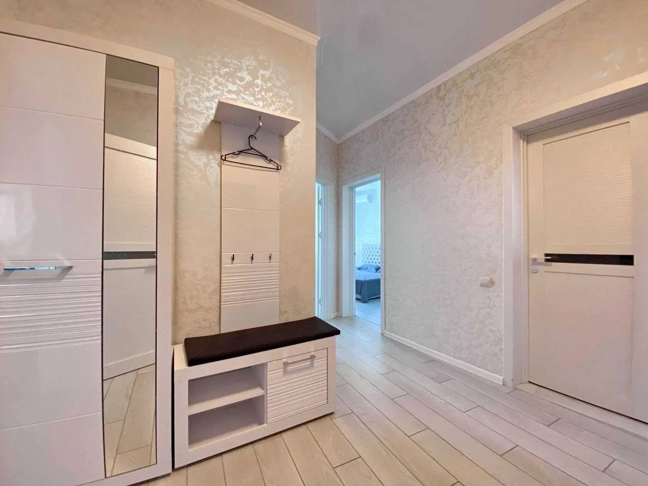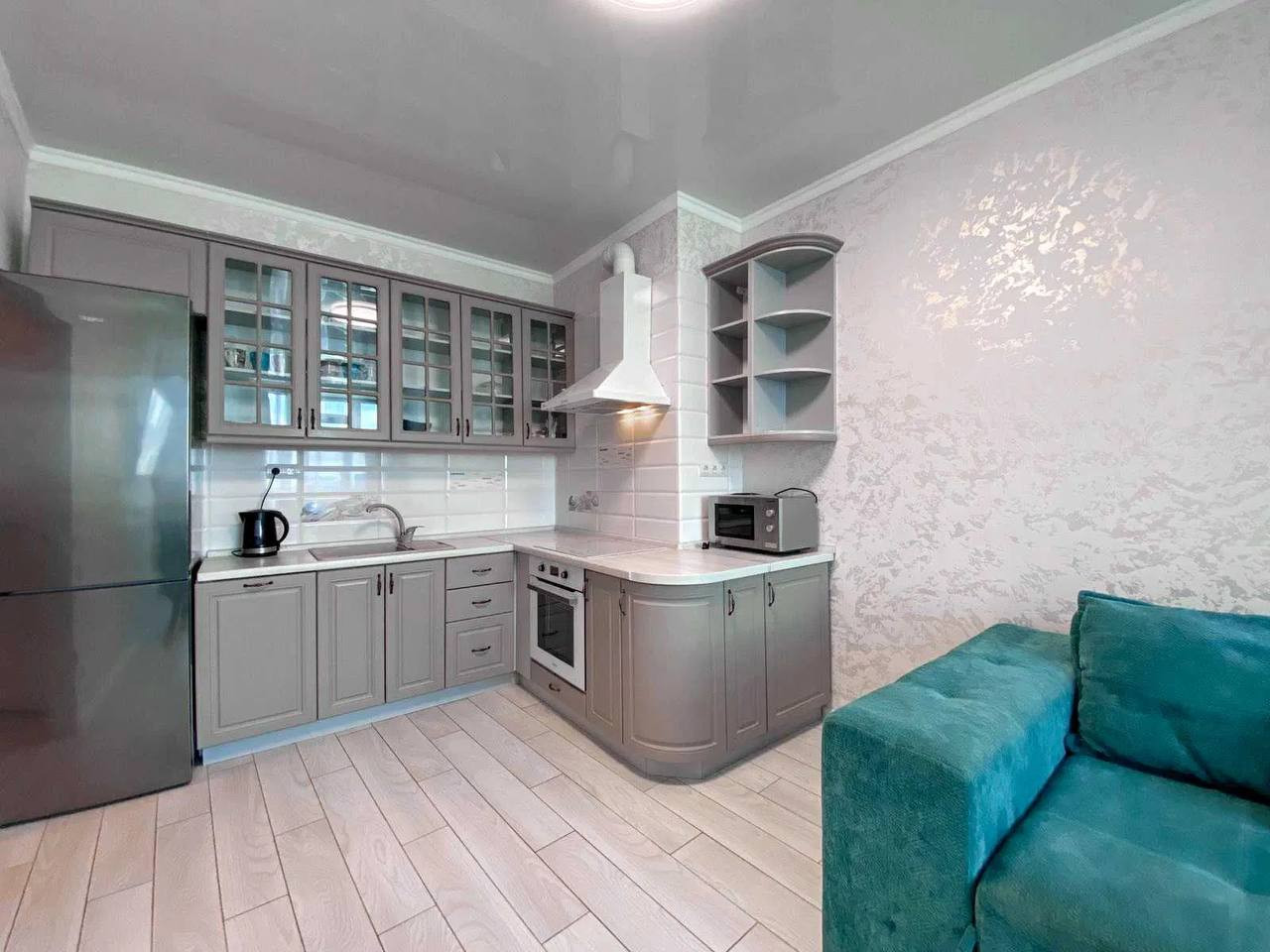 Внутри квартиры обновленный интерьер с современными отделочными материалами и эргономичной планировкой, создающей максимально уютную и просторную обстановку. Кухня оборудована современной техникой и имеет большое количество шкафов и рабочих поверхностей для удобства приготовления пищи.