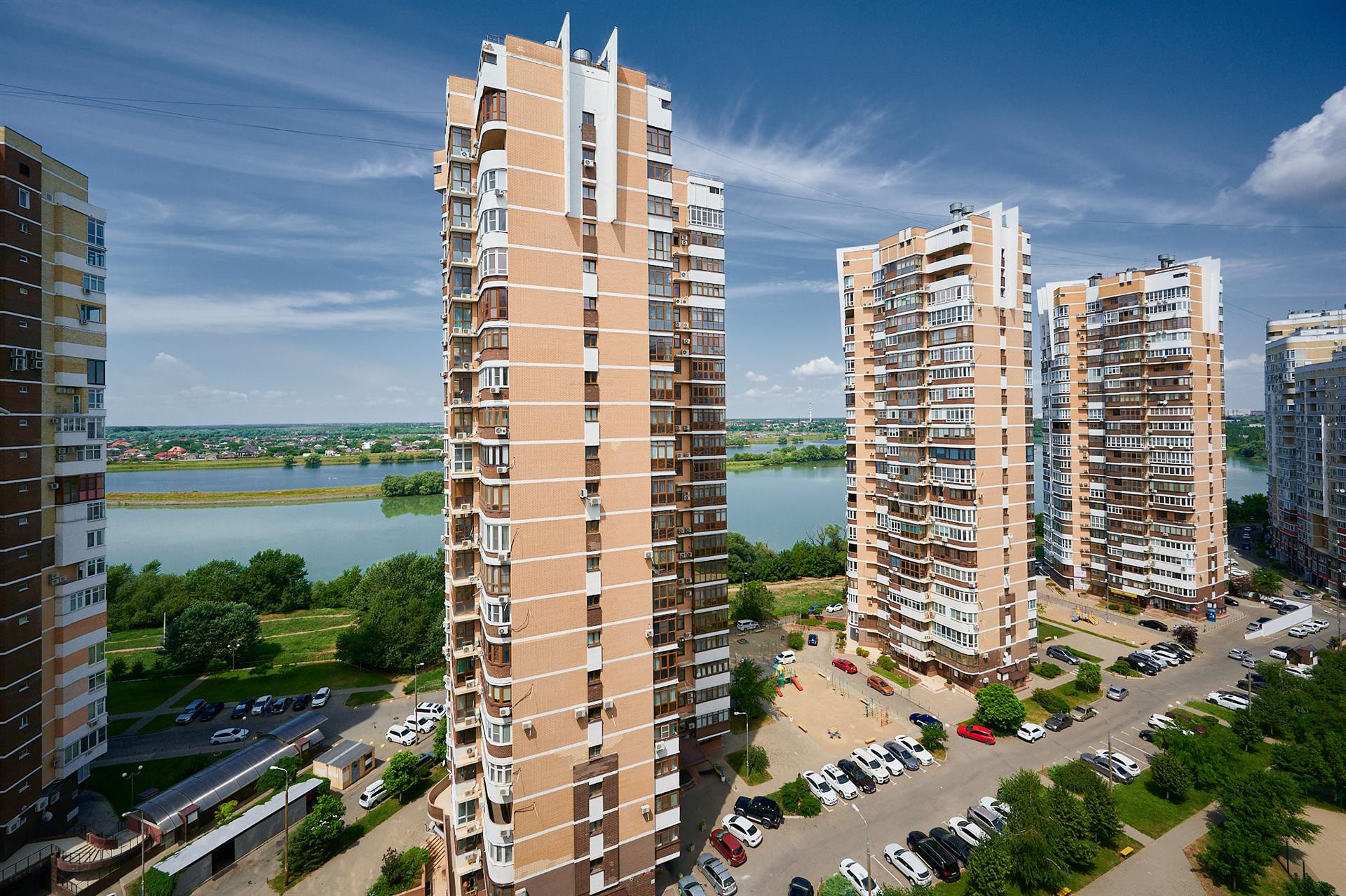 Расположена в живописном комплексе, где есть все необходимые удобства для комфортной жизни - магазины, детские и спортивные площадки, кафе и кофейни, а также надземная и подземная парковки. Из окон квартиры открывается прекрасный вид на реку Кубань.