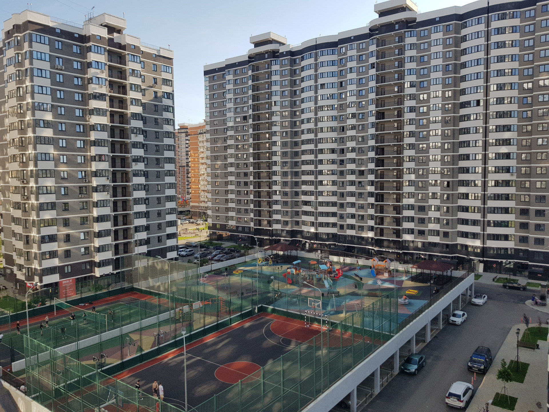 Во дворе двухуровневый стилобат: под ним парковка, а на нем детская и спортивная площадка, доступна только для жильцов комплекса.