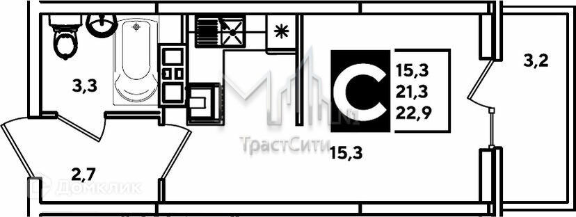 Общая площадь 22.9 м2