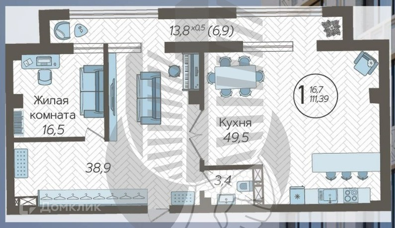 Жилая площадь 38.9 м2