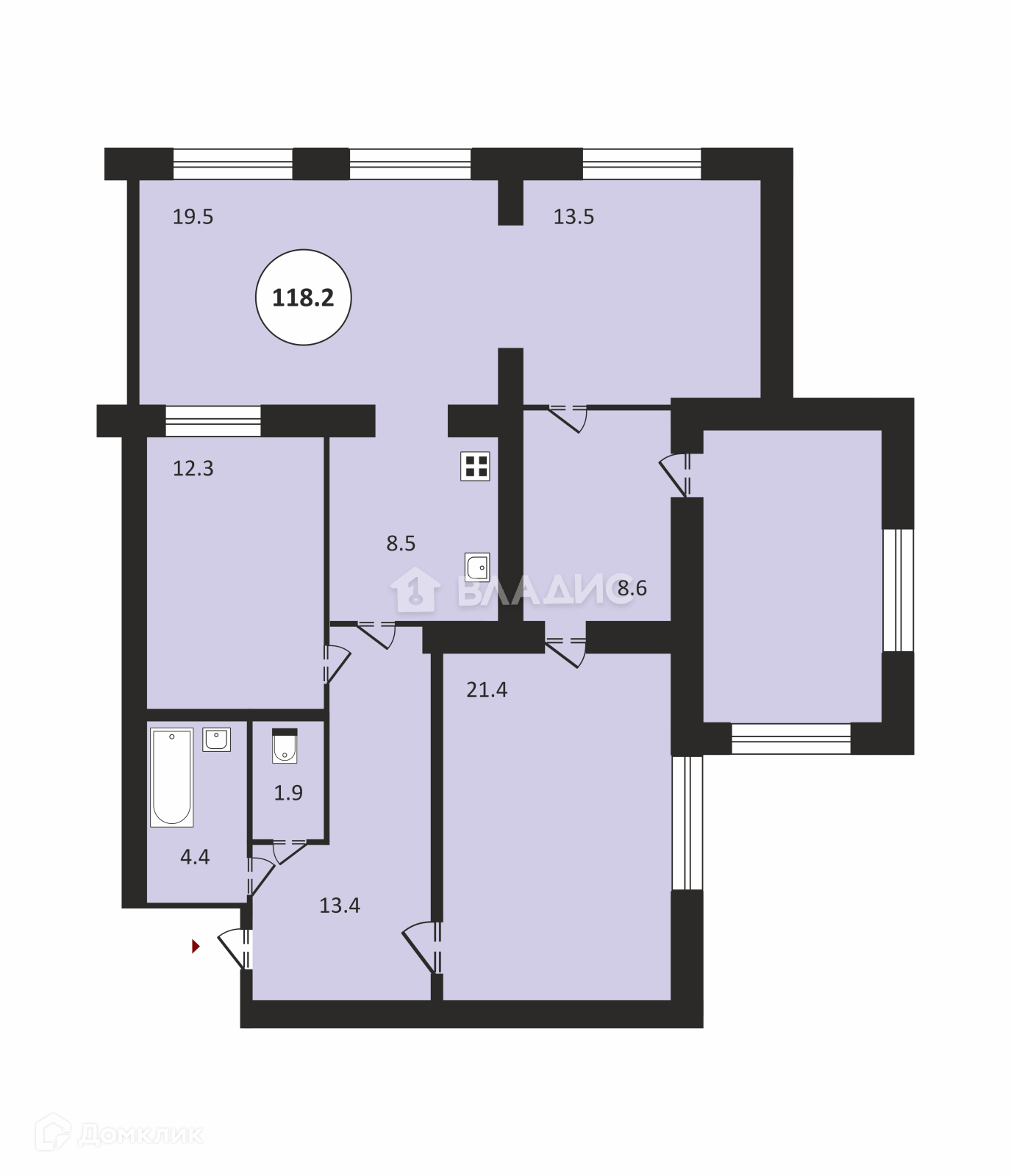 - 4 х-комнатная квартира площадью 118.2 кв. м.;