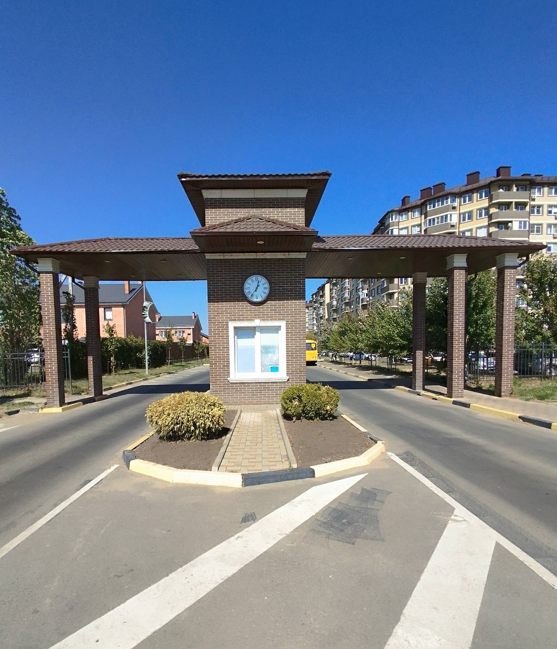 Территория комплекса огорожена на въезде красивая арка с часами.