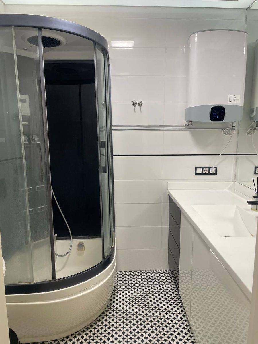 Просторная ванная комната с современными отделками и стильной сантехникой предлагает спокойствие и комфорт. Здесь вы можете расслабиться в ванне или освежиться под дождевым душем.