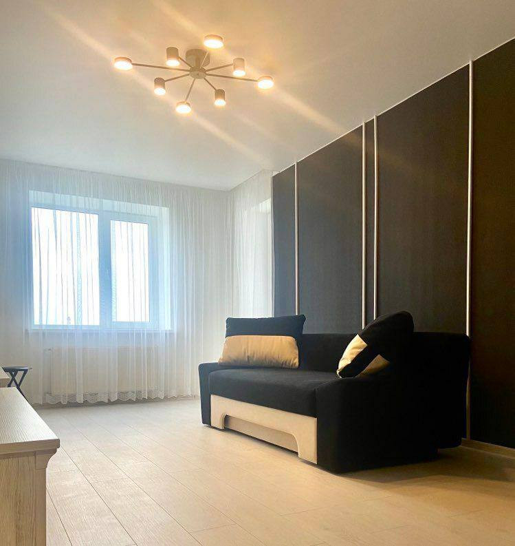Просторная гостиная, обставленная с учётом последних тенденций дизайна, создает уютную и современную атмосферу для отдыха и развлечений.